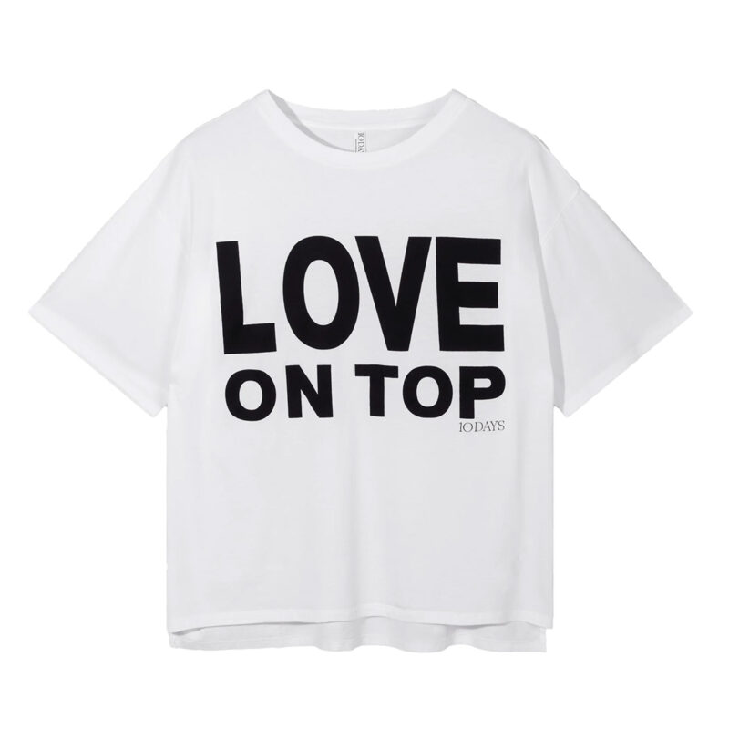 10DAYS T-Shirt „Love“. Das 10DAYS T-Shirt „Love“ ist ein lässiges Statement-Piece für deinen Alltag. Das Oversized Fit Shirt besteht aus weicher, GOTS-zertifizierter Bio-Baumwolle und überzeugt mit einem besonders angenehmen Tragegefühl. Durch seine lockere Silhouette lässt es sich vielseitig kombinieren – ob zu Jeans, Shorts oder entspannten Lounge-Looks. Der klassische Rundhalsausschnitt mit Rippbündchen sorgt für eine bequeme Passform, während der „Love on Top“-Print auf der Vorderseite dem Shirt eine subtile, charakteristische Note verleiht. Ein kleines Label links unten auf dem Rücken rundet das Design typisch für 10DAYS ab. Gefertigt in Portugal steht das T-Shirt für hochwertige Verarbeitung und nachhaltige Materialien.