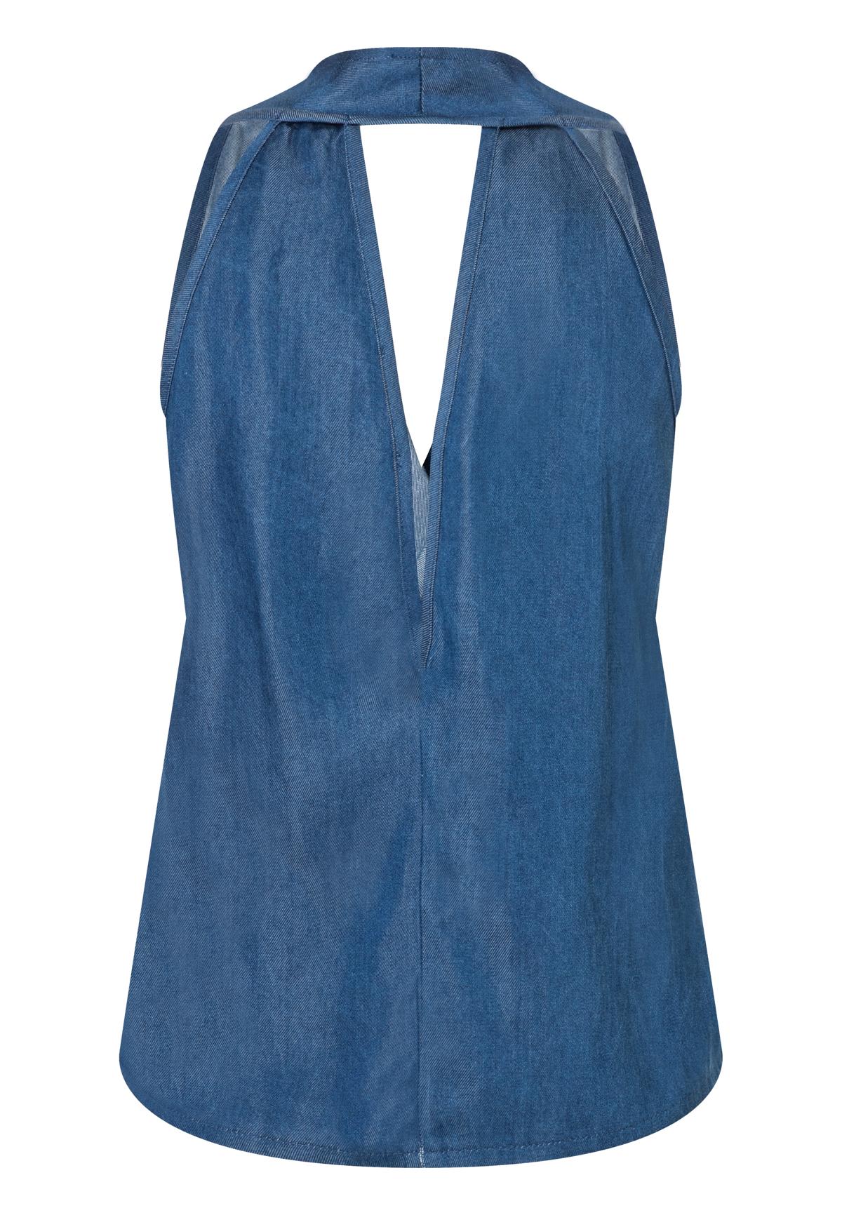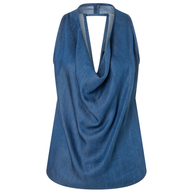 Ana Alcazar Neckholder-Top „Sommerjeans“ Das Jeanstop aus Sommerdenim ist ein stilvolles Essential für warme Tage. Der ärmellose Neckholder-Schnitt setzt Schultern und Rücken schön in Szene, während der fließende Wasserfallkragen weich fällt und dem Look eine elegante Note gibt. Das Material wirkt denim-cool, trägt sich aber angenehm leicht und glatt. In der Länge ist das Top hüftnah und lässt sich unkompliziert in Bundformen stecken oder locker darüber tragen. Perfekt für Urlaub, Dinner-Dates oder sommerliche Events: Kombiniere es als harmonischen Zweiteiler zur passenden weiten Palazzo-Hose, mit Sandaletten und Clutch, oder trage es lässig zu Shorts und Sneakern.