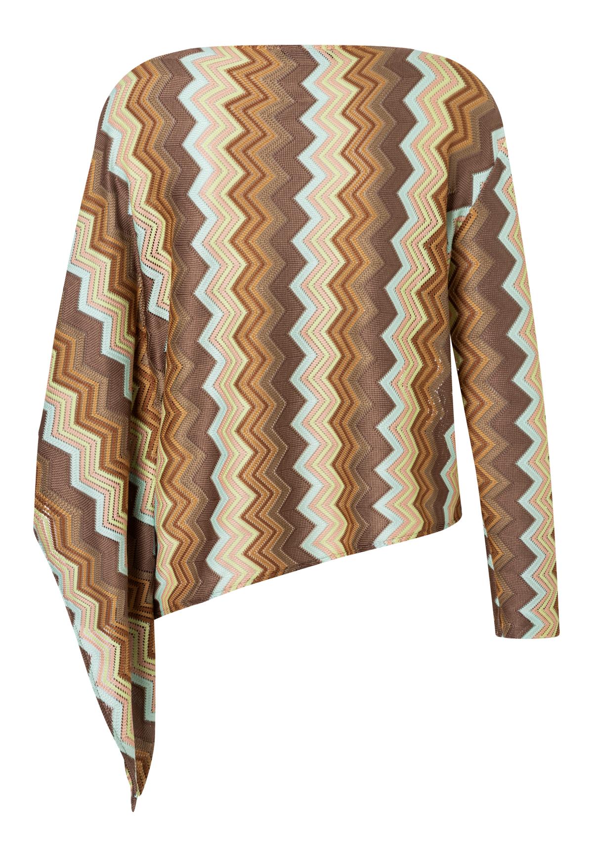 Der einärmelige Schnitt auf der rechten Seite und die ponchoartige, offene Silhouette auf der linken Seite sorgen für eine fließende Bewegung und einen spannenden Kontrast aus Struktur und Leichtigkeit. Das grafische Zickzack-Muster unterstreicht den individuellen Charakter des Shirts und macht es zum Blickfang – ob casual gestylt oder elegant kombiniert.