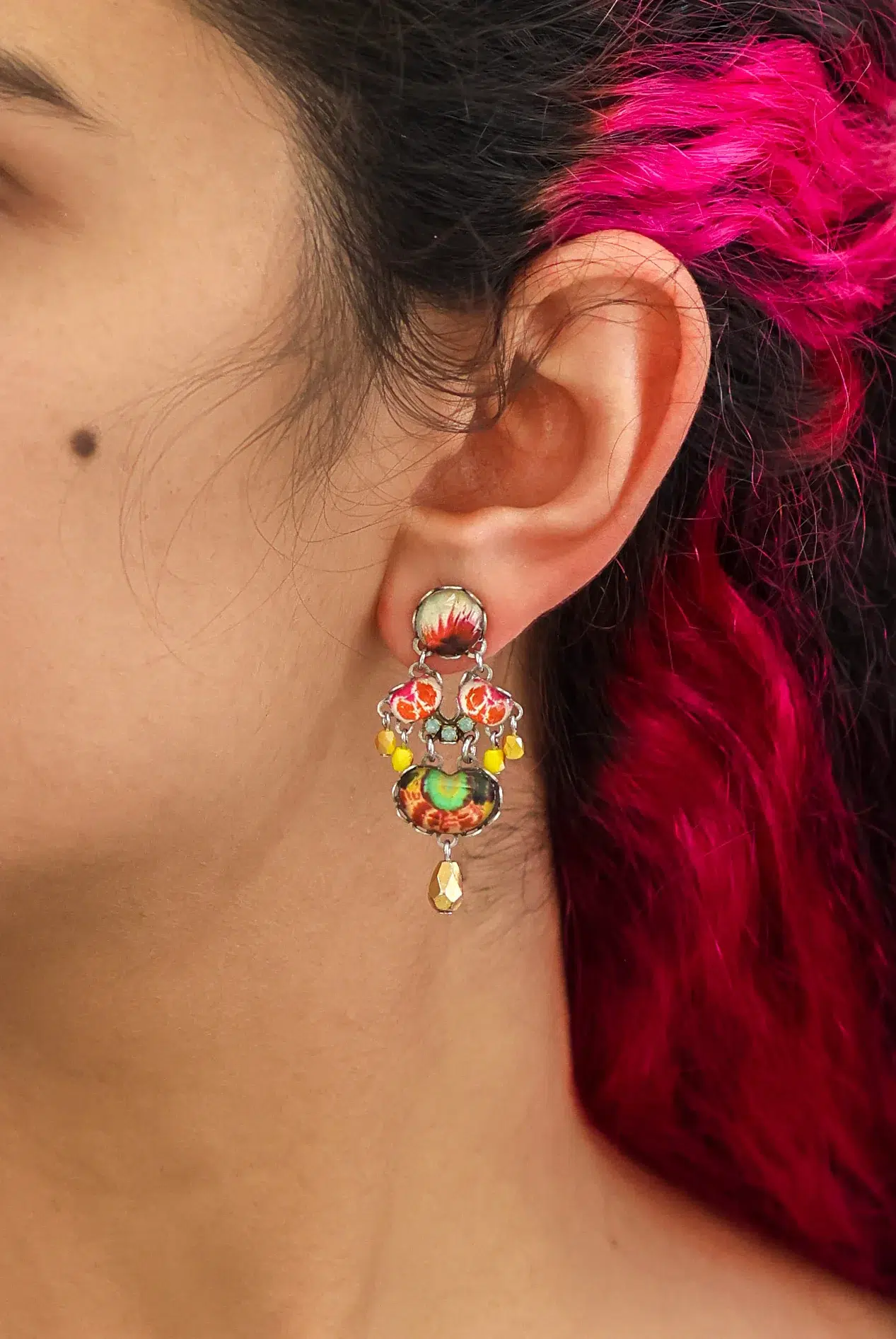 Ayala Bar Ohrringe „Bliss Sunflower Surprise“. Die Ohrringe „Bliss Sunflower Surprise“ verzaubern mit einer harmonischen Komposition aus warmen Goldtönen, leuchtendem Gelb und lebendigen Akzenten in Rot, Grün und Türkis. Das Design erinnert an sonnendurchflutete Sommerwiesen und strahlt Ruhe, Lebensfreude und kreative Leichtigkeit aus.