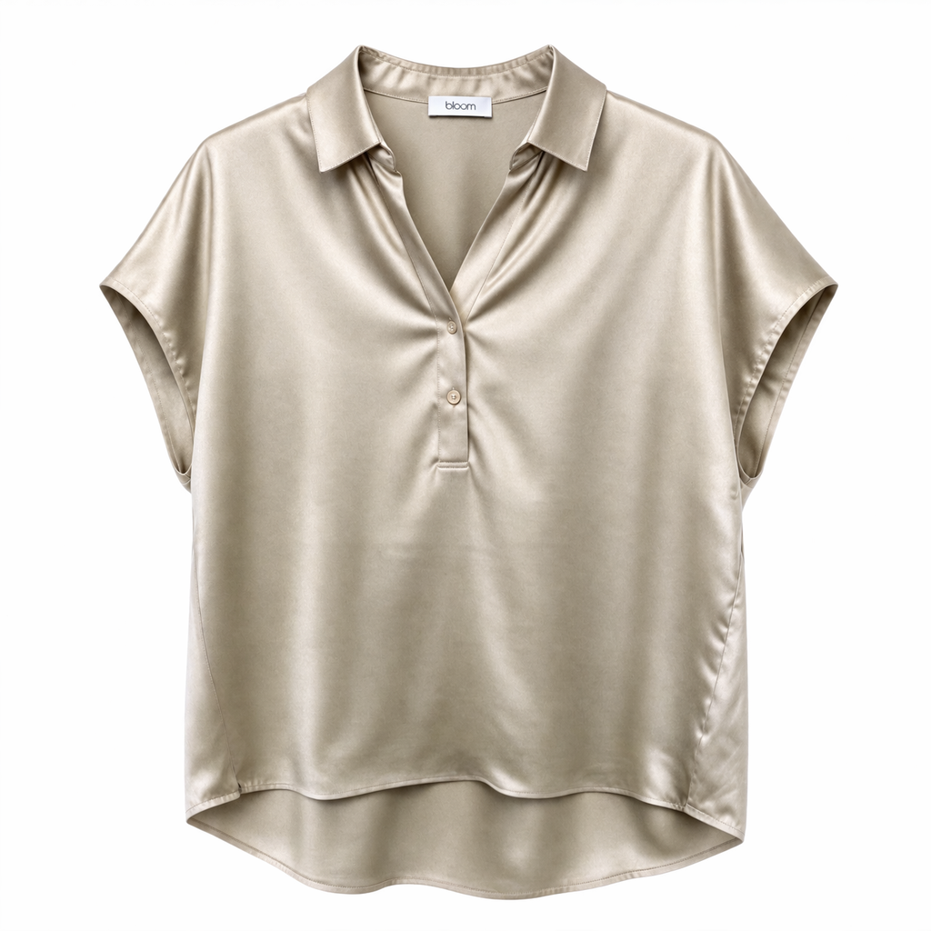 Bloom Bluse „Polo Oversized Oatmeal“. Das moderne Design trifft auf eine lässig-elegante Polo-Silhouette und verleiht dem Look durch hochwertige Seide eine stilvolle Leichtigkeit.