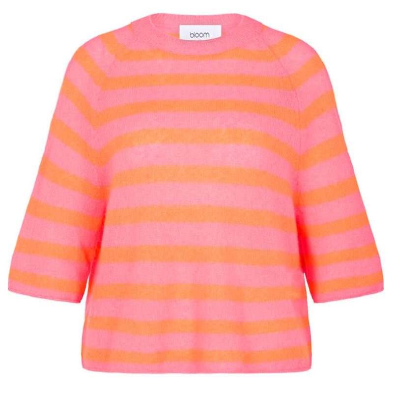 Bloom Pullover Rundhals „Papaya Stripes“. Der Pullover besticht durch einen geraden Schnitt mit einem klassischen Rundhals-Ausschnitt. Die kurzen Raglanärmel sorgen für eine sportlich-legere Silhouette und maximale Bewegungsfreiheit. Die Oberfläche bietet eine seidenweiche, sanfte Haptik, die auf der Haut angenehm trägt. Die luxuriöse Mischung aus Kaschmir und Seide sorgt für Wärme, Leichtigkeit und einen glatten Griff. Die Stoffstruktur mit Papaya-Stripes-Print verleiht dem Modell eine frische, frühlingshafte Note. Ein legerer, vielseitiger Pullover, der Komfort, hochwertige Materialqualität und modische Stripes-Optik vereint.