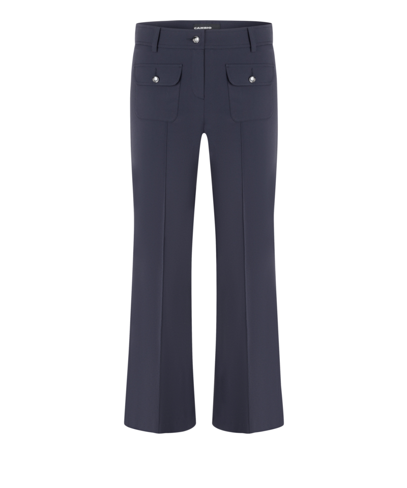 Cambio Hose „Farah Patched“ Blau . Die wunderschöne Cambio „Farah“ in leicht verkürzter Länge und auffällig aufgesetzten Taschen mit Knopf bietet nicht nur die perfekte Basis für elegante, classy Looks, sondern ist auch besonders schön, wenn man sie sportlich mit Sneakern trägt. Mit dieser Hose sind Sie zu jeder Jahreszeit perfekt gekleidet.