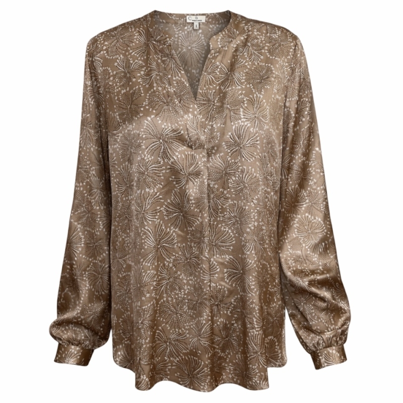 Charlotte Sparre Seidenbluse „Spark Taupe“. Die Charlotte Sparre Seidenbluse „Spark“ in Taupe überzeugt durch einen tollen Print und eine erstklassige Qualität. Der V-Ausschnitt wird von einem dezenten kleinem Stehkragen begleitet. Der Schnitt besitzt einen abgerundeten Saum, wodurch eine elegante Silhouette entsteht. Die Bluse ist langarmig und verfügt über eine 1-Knopf-Manschette. Gefertigt ist es aus einer Satinseide und Spandex, was einen luxuriösen Glanz mit angenehmer Dehnbarkeit verbindet.