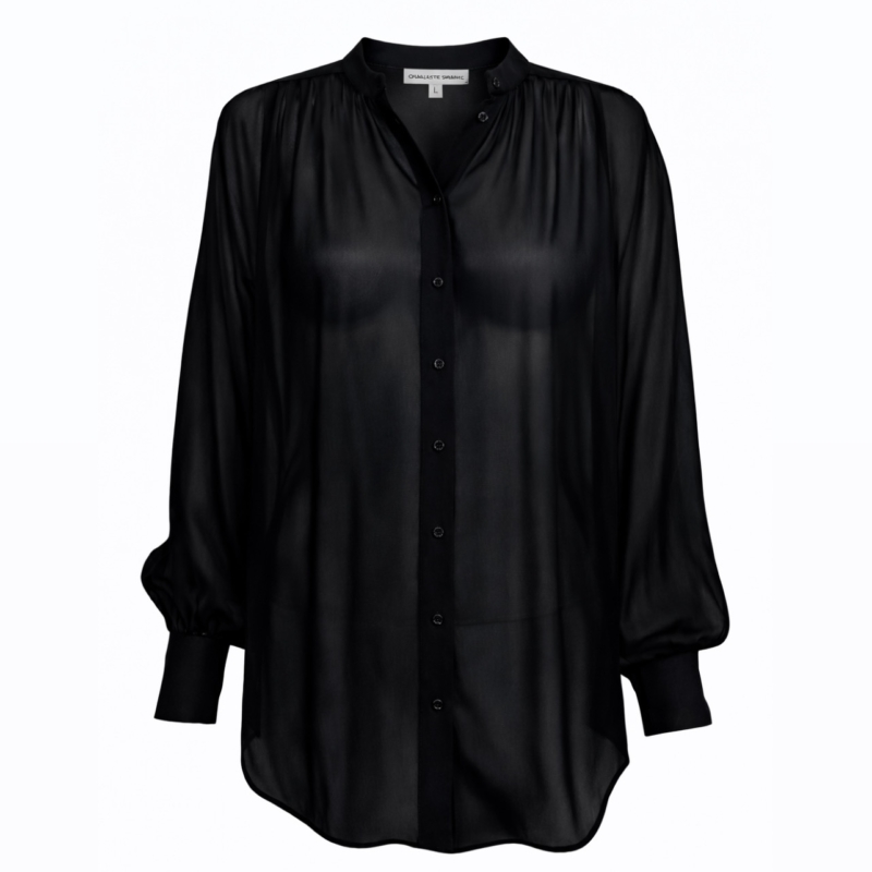 Charlotte Sparre Seidenbluse „She Matt Black“. Die Charlotte Sparre Seidenbluse in einem matten schwarz besticht durch eine leicht transparente Optik und hochwertige Qualität. Der Rundhals-Ausschnitt wird von einer zarten Kräuselung an der Schulter ergänzt, während eine dezente Knopfleiste dem Look Struktur verleiht. Der Saum ist abgerundet, und die Bluse verfügt über lange Ärmel mit einer breiten 2-Knopf-Manschette.