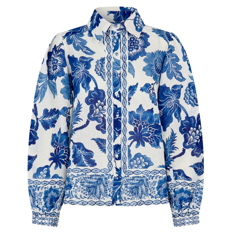 Der voluminöse Ärmel verleiht der Bluse eine elegante, modische Silhouette und sorgt für einen ausdrucksstarken, femininen Look. Die reguläre Passform bietet dabei eine harmonische Balance aus Komfort und Raffinesse. Das ausdrucksstarke florale Muster in tiefen Blautönen auf hellem Grund wirkt zugleich klassisch, modern und luxuriös – ein echtes Statement-Piece für die Sommergarderobe.