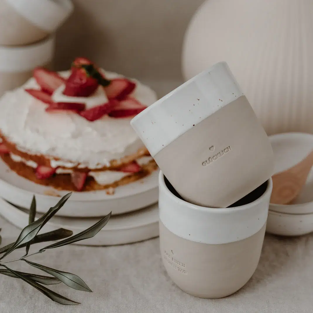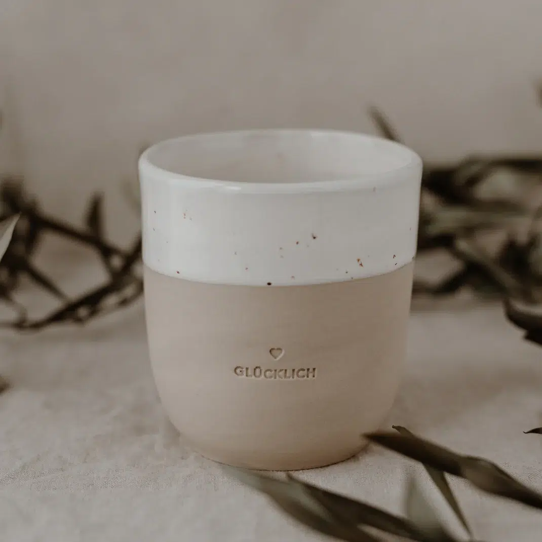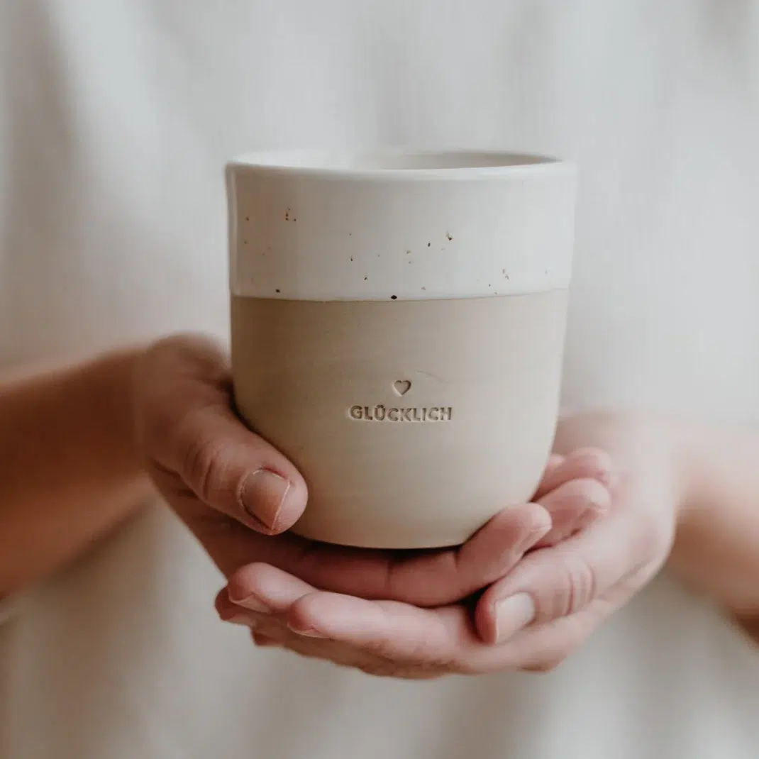 Vom ersten Formen des Tons bis zum finalen Brand durchläuft jeder Becher mehrere liebevolle Arbeitsschritte: handgefertigt, gebrannt, geprägt, geschliffen, glasiert und nochmals gebrannt. Genau diese besondere Verarbeitung sorgt für die hochwertige Haptik und die natürliche Optik, die den „Glücklich“-Becher so besonders macht.