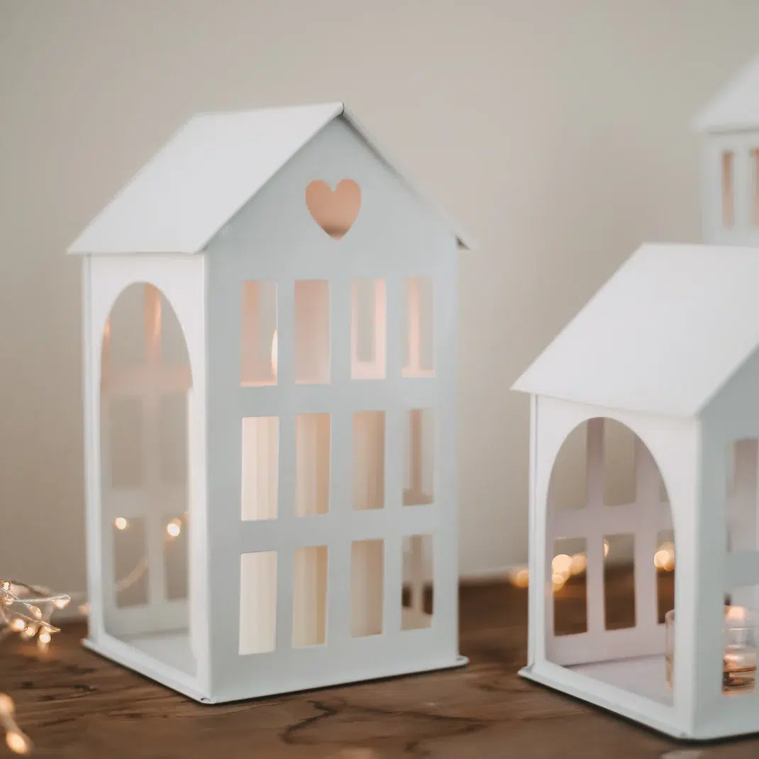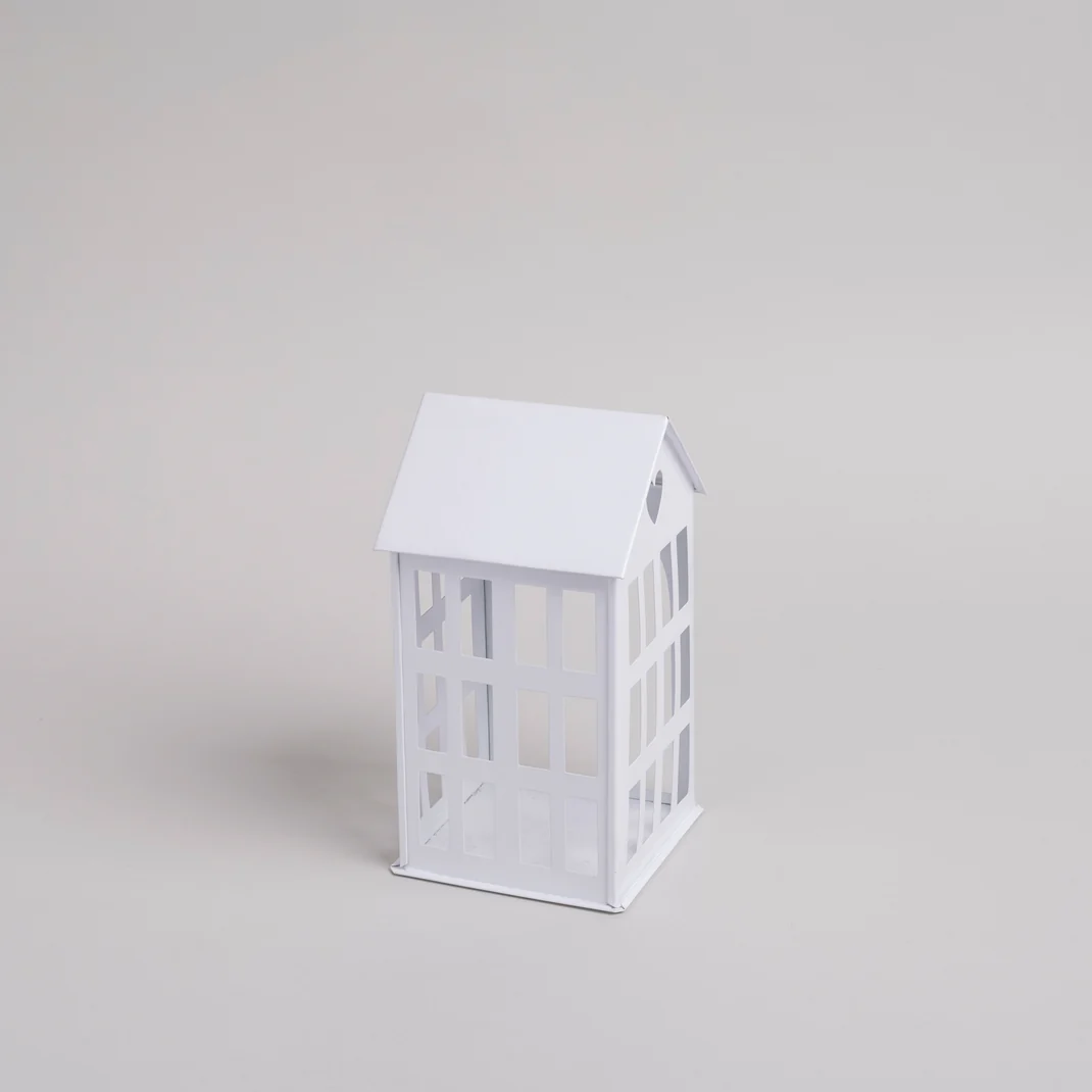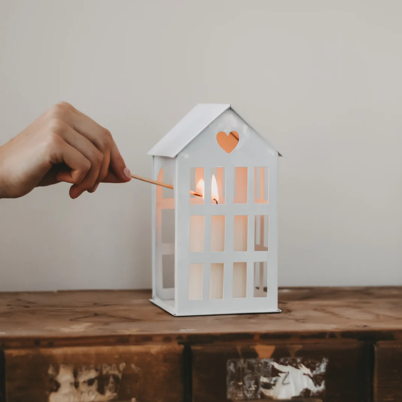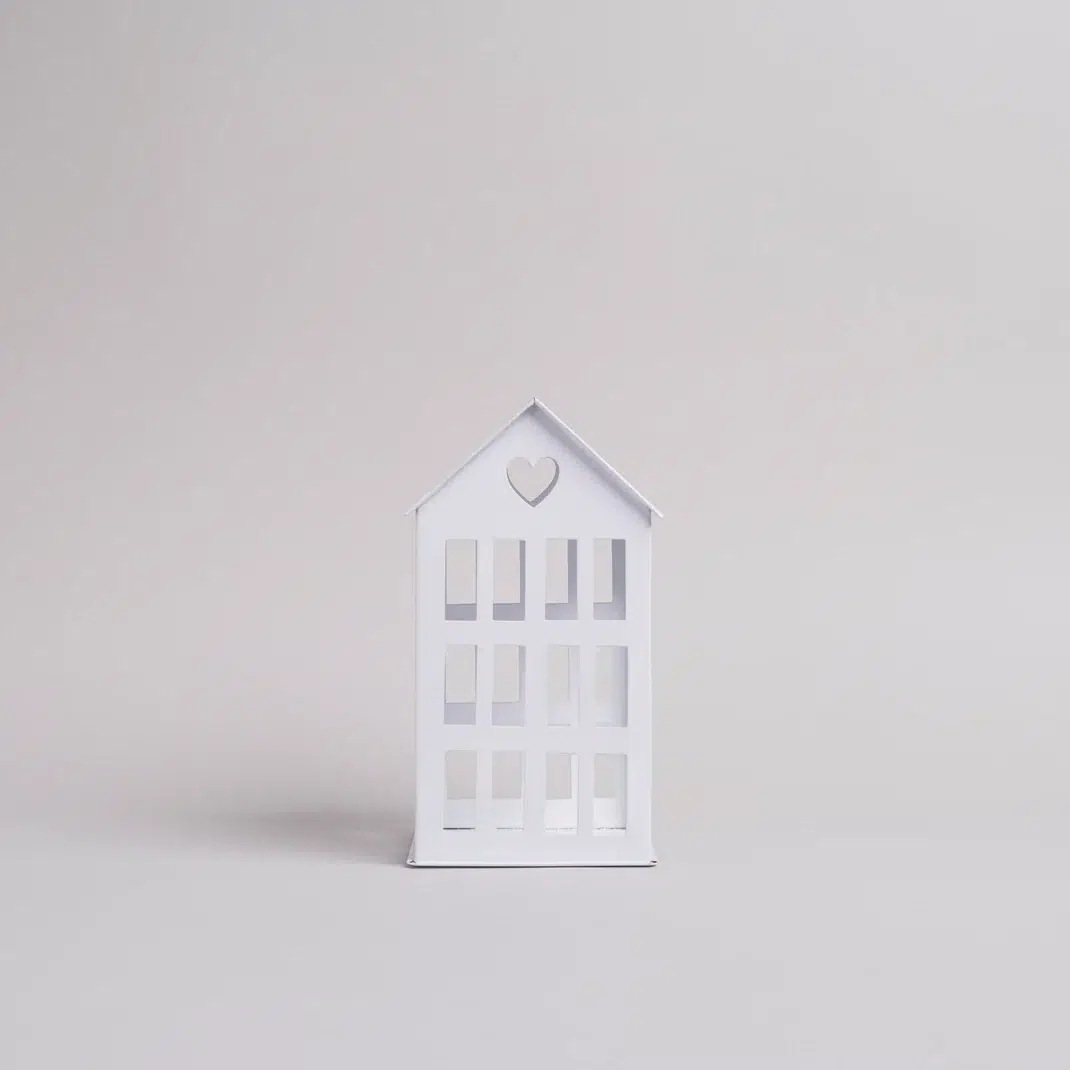 Eulenschnitt Metallhaus mittel weiß. Das mittlere Metallhaus in Weiß verleiht deinem Zuhause mit seinem minimalistischen Design eine Note zeitloser Eleganz und bietet unzählige Möglichkeiten zur individuellen Dekoration. Ob als leuchtendes Highlight mit einer zarten Lichterkette im Regal, als festlicher Blickfang mit einer Kerze auf dem Tisch oder ganz schlicht und unbeleuchtet – dieses kleine Häuschen zieht in jeder Variante alle Blicke auf sich. Mit seinen filigranen Details, den zahlreichen Fenstern und dem herzförmigen Ausschnitt im Dach ist es ein liebevoll gestaltetes Dekoelement.
