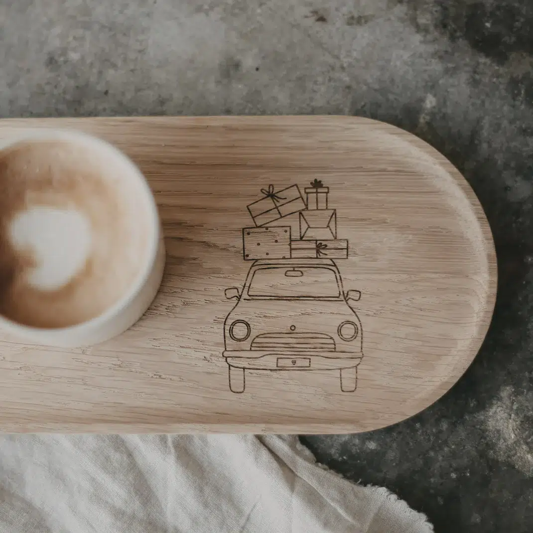 Eulenschnitt Tablett „Weihnachtsauto“. Das perfekte Accessoire für deine weihnachtliche Dekoration. Das liebevoll handgezeichnete Weihnachtsauto wurde von Eulenschnitt entworfen und verleiht dem Tablett eine besondere, persönliche Note. Dieses kleine Tablett ist ideal, um deinen Liebsten in der Adventszeit stilvoll Glühwein, Tee oder Kaffee zu servieren. Die vielseitigen Verwendungsmöglichkeiten machen es zu einem echten Allrounder: Platziere eine Vase mit winterlichen Blumen darauf oder setze deine Lieblingskerze gekonnt in Szene. Die warme, natürliche Optik des Eichenholzes bringt eine gemütliche Atmosphäre in dein Zuhause und lässt sich wunderbar mit anderen Dekoelementen kombinieren. Dank seiner kompakten Größe passt das Tablett perfekt auf jeden Tisch oder jede Anrichte und ist ein echter Hingucker.