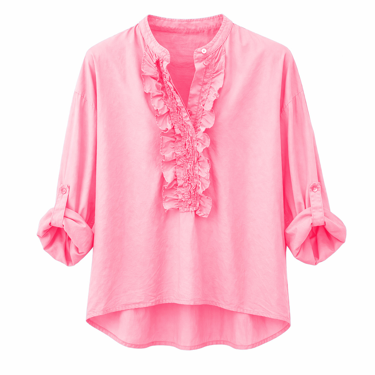 Flowers for friends Bluse „Ruffles Bubblegum Pink“. Die Bluse „Ruffles Bubblegum Pink“ von Flowers for Friends ist ein echter Hingucker und bringt frische, feminine Leichtigkeit in jeden Look. Der leuchtende Pinkton setzt ein modisches Statement, während die verspielten Rüschen entlang der Knopfleiste für eine romantische, detailverliebte Note sorgen. Die lockere Silhouette und die leicht verlängerte Rückenpartie verleihen der Bluse eine moderne, entspannte Ausstrahlung. Die hochgekrempelten Ärmel mit fixierbarem Riegel unterstreichen den lässigen Charakter und machen das Modell besonders vielseitig. Gefertigt aus reiner Baumwolle überzeugt die Bluse mit einem angenehm luftigen Tragegefühl – ideal für warme Tage oder unkomplizierte Alltagsstyles.