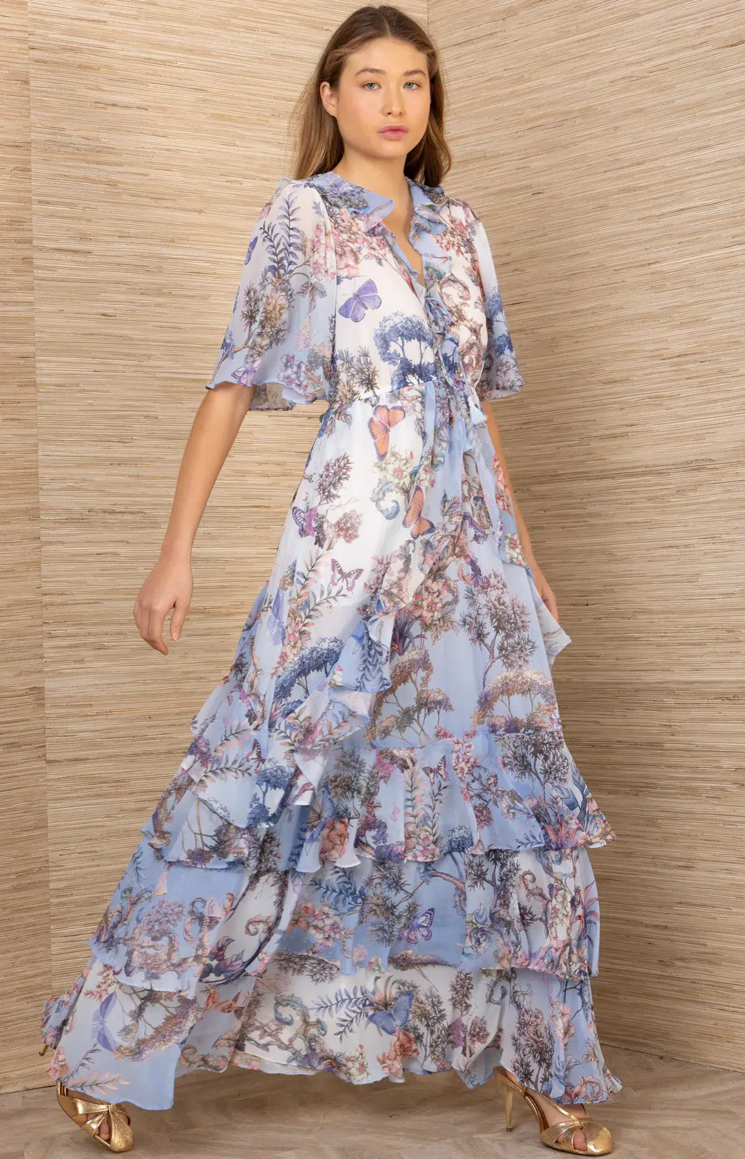 Hale Bob Maxikleid Chiffon „Blau“. Ein Chiffonkleid, das Eleganz und Boho-Flair auf wunderschöne Weise vereint. Es ist vollständig gefüttert und präsentiert sich mit einem ornamentefinen Print in Blautönen. Das Bindedetail am vorderen Oberteil sowie Rüschendetails entlang des gesamten Körpers verleihen dem Kleid eine romantische Note. Die Glockenärmel in Ellbogenlänge vervollständigen das Look-and-Feel und sorgen für einen luftigen, naturverbundenen Stil.