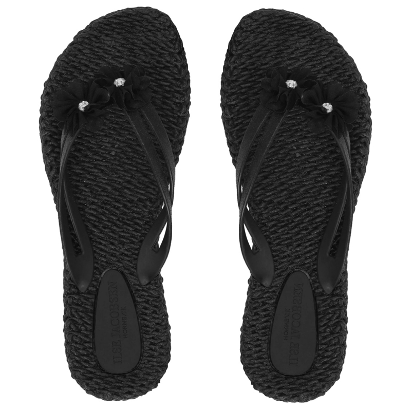 Ilse Jacobsen Flip Flop „Flowers Black“. Das perfekte Paar für den Sommer: Diese Cheerful Flip-Flops begeistern mit doppelten Glimmer-Riemen und zwei dekorativen Blumen, die dem Design eine verspielte, feminine Note verleihen.