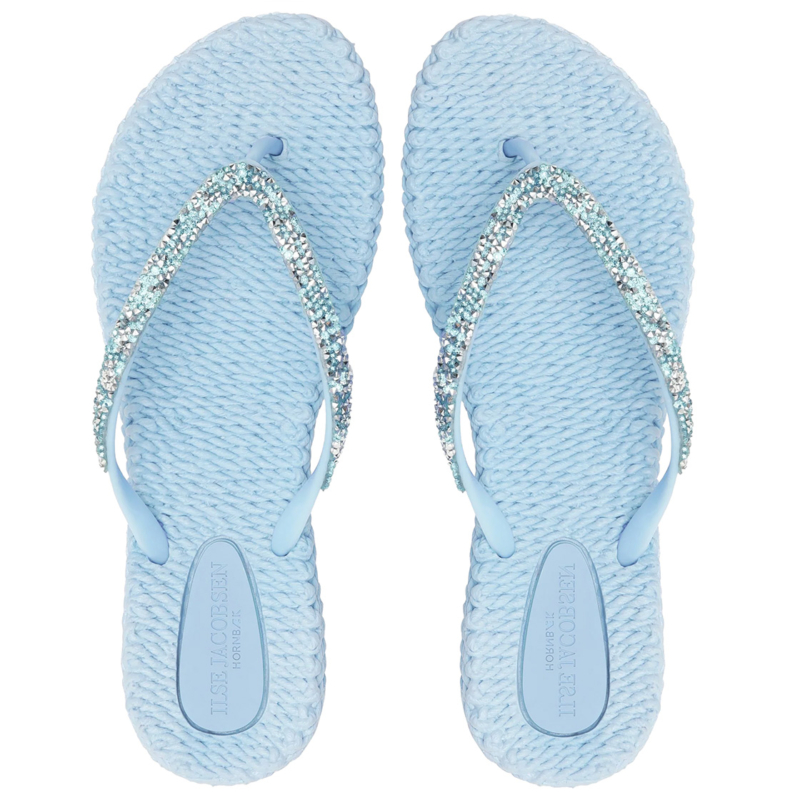 Ilse Jacobsen Flip Flop „Rhinestones“ Blue Bell. Diese flexiblen Cheerful Flip-Flops vereinen sommerliche Leichtigkeit mit einem Hauch Glamour. Der Zehensteg ist mit schimmernden, mehrfarbigen Glitzersteinen verziert und setzt funkelnde Akzente – perfekt für stilvolle Auftritte am Strand oder in der City.