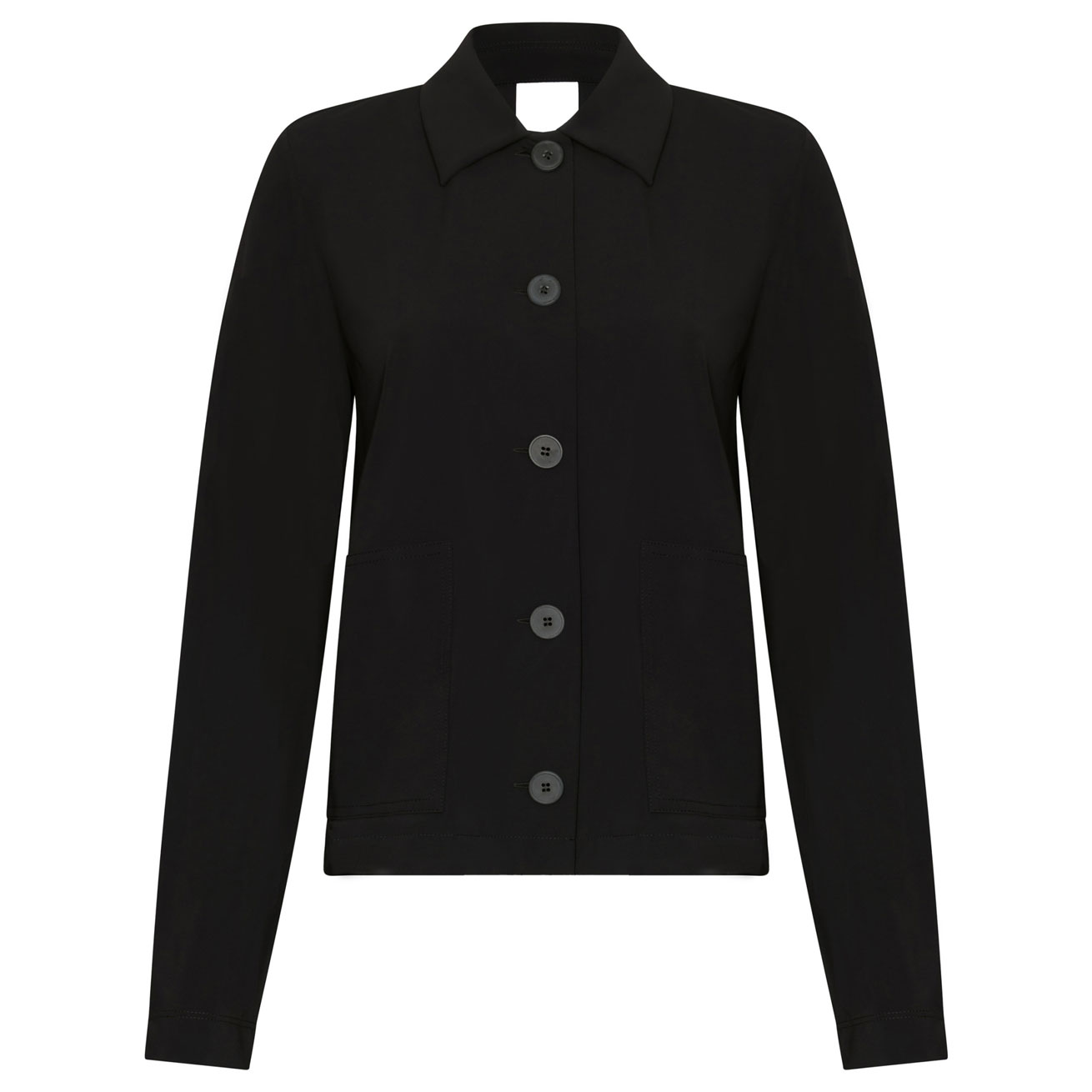 Japan TKY Blazer „Chisami“ Deep Black. Der Japan TKY Blazer „Chisami“ ist ein stilvoller Blazer aus komfortablem Technostretch. Er zeichnet sich durch einen spitz zulaufenden Kragen aus, der eine moderne, elegante Silhouette schafft. Dezente Schulterpolster sorgen für eine gleichmäßige Formgebung der Schulterlinie, ohne aufzutragen. Die Knopfleiste verläuft durchgängig und betont die klare Linienführung des Blazers. Die Ärmel sind lang und leicht spitz zulaufend, was eine smarte, figurnahe Passform unterstützt. Die Manschetten zeigen eine Doppellagigkeit, die dem Look eine raffinierte Note verleiht. Ton-in-Ton-Knöpfe runden das stilvolle Erscheinungsbild ab. Der Material-Mix sorgt für eine formstabile, angenehme Dehnung und garantiert hohen Tragekomfort. Insgesamt vermittelt der Blazer eine moderne, elegante Ausstrahlung und eignet sich ideal für Business- oder Casual-Looks.