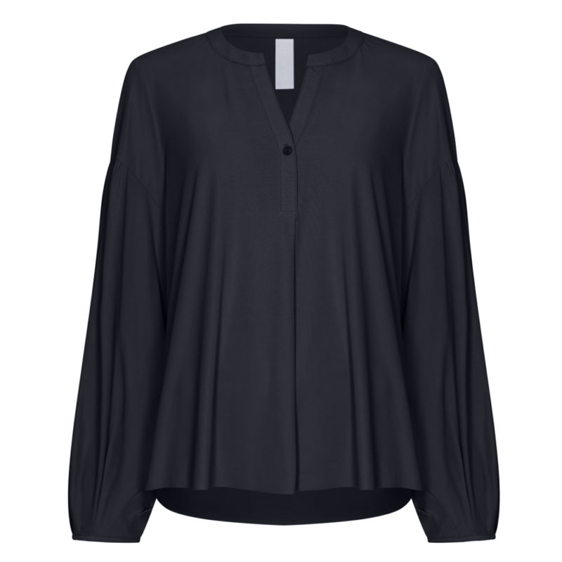 Japan TKY Bluse „Byaku“ Black blue. Die Japan TKY Bluse „Byaku“ in Black Blue vereint moderne Eleganz mit femininer Raffinesse. Der V-Ausschnitt mit einem Knopf, der darunter abgenäht ist, setzt einen dezenten, stilvollen Akzent und sorgt für eine schmeichelhafte Silhouette. Die angepufften Ärmel verleihen der Bluse eine verspielte, modische Note und machen sie zu einem Blickfang in jedem Outfit. Gefertigt aus leichtem, atmungsaktivem Travel-Stoff, liegt die Bluse angenehm weich auf der Haut, ist knitterarm, pflegeleicht und bietet hohen Tragekomfort – ideal für Alltag, Büro oder besondere Anlässe. Die zeitlose Black Blue-Farbgebung macht sie vielseitig kombinierbar, ob zu Jeans für einen lässigen Look oder zu eleganten Stoffhosen für einen chicen Auftritt.