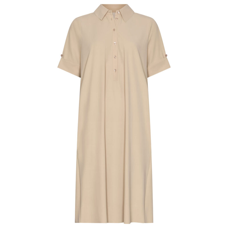 Japan TKY Kleid „Veona“ Spiaggia. Das Japan TKY Kleid „Veona“ ist ein stylisches Kleid aus komfortablem Technostretch. Es überzeugt durch einen geraden, legeren Schnitt, der eine lässige Silhouette schafft. Der Hemdblusenkragen verleiht dem Look eine klassisch-elegante Note, während die kurze, verdeckte Knopfleiste eine saubere Linienführung sicherstellt. Das Kleid ist knielang und verfügt über kurze Ärmel, was es perfekt für warme Tage macht. Seitliche Eingrifftaschen bieten praktische Stauraummöglichkeiten, ohne den fließenden Fall zu stören. Der Material-Mix sorgt für eine formstabile Dehnung und garantiert hohen Tragekomfort. Insgesamt strahlt das Kleid eine moderne, vielseitige Eleganz aus und eignet sich sowohl für casual als auch für leicht formelle Anlässe.