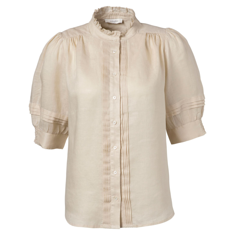 Jc Sophie Bluse „Lagos Sand“. Die Bluse besticht durch eine klassisch feminine Silhouette. Der Stehkragen wird von einer zarten Rüsche eingerahmt, was dem Oberteil eine subtile Romantik verleiht. Die durchgehende Knopfleiste sorgt für eine klare Linienführung, während der 1/2-Arm mit Manschette einen sauberen Abschluss und angenehme Bewegungsfreiheit bietet. Die feinen Biesen verleihen Struktur und eine gepflegte, formschöne Optik.