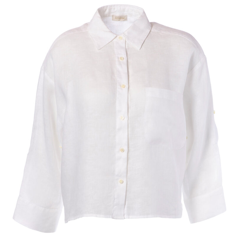 Jc Sophie Bluse „Mary Lou“ Weiß. Die JC Sophie Bluse „Mary Lou“ in Weiß ist eine zeitlose, lässige Hemdbluse aus leichtem Leinen, die durch ihre klare Linie und natürliche Eleganz überzeugt. Der klassische Hemdkragen, die durchgehende Knopfleiste und die locker fallende Passform sorgen für einen entspannten, modernen Look. Eine aufgesetzte Brusttasche sowie die leicht verkürzten, weiten Ärmel unterstreichen den minimalistischen Stil. Die frische, weiße Farbe macht die Bluse zu einem vielseitigen Essential für jede Garderobe. Gefertigt aus 100 % Leinen ist sie besonders atmungsaktiv und ideal für warme Tage.