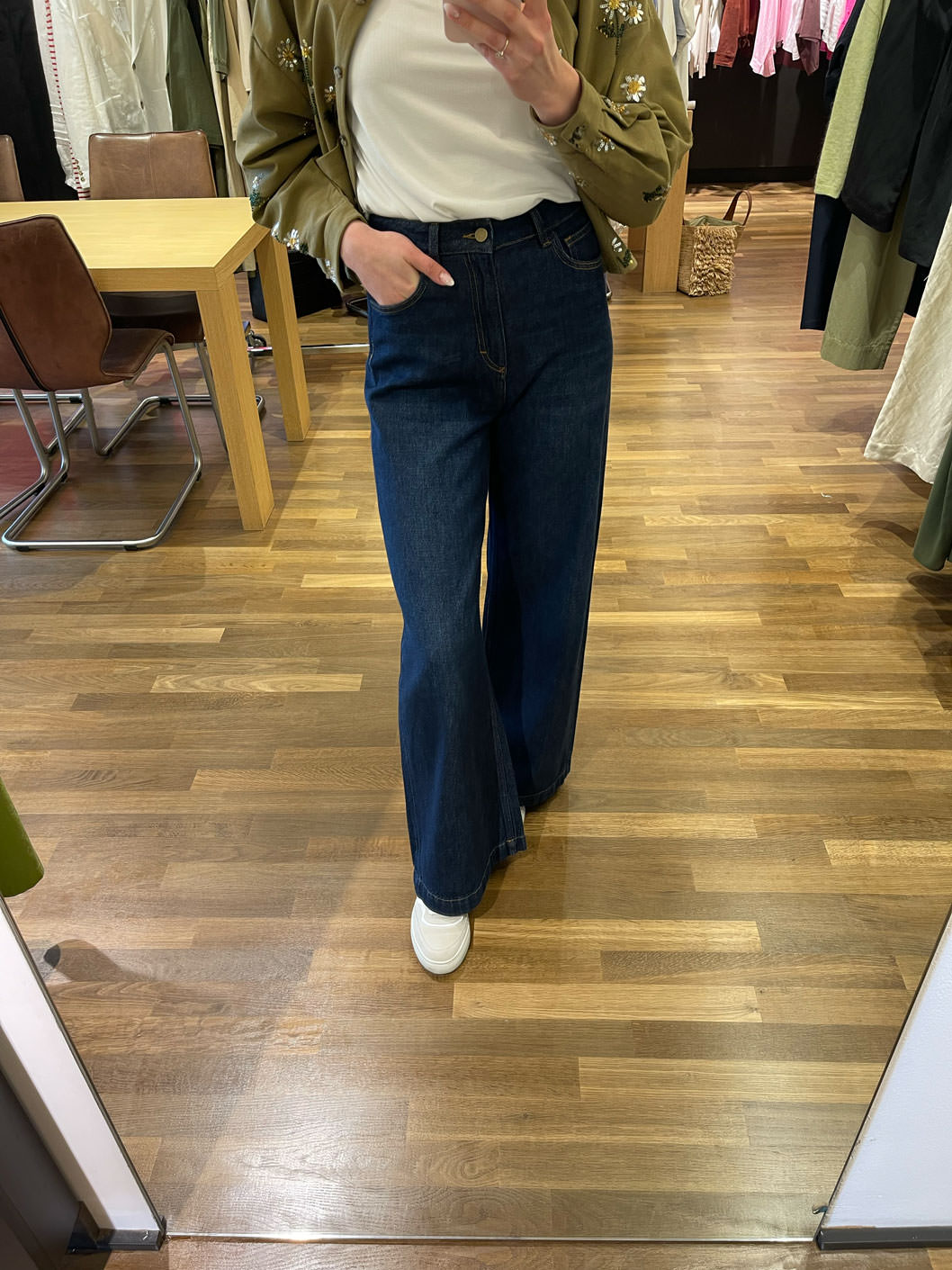 Jc Sophie Jeans „Lacey dark Denim“. Die Jc Sophie Jeans „Lacey dark Denim“ ist ein cooles Basic, das in keinem Kleiderschrank fehlen darf. Mit ihrem High Waist-Schnitt und dem weiten Bein liegt sie voll im Trend und sorgt für eine lässige, moderne Silhouette. Dank des klassischen Denim-Farbtons lässt sich die Jeans vielseitig kombinieren – ob mit einem Langarmshirt, einer Bluse oder einem Pullover von Jc Sophie. Für einen stilvollen Alltagslook kannst Du dazu eine Jacke wie die „Livorno Maroon“ Wildlederjacke von Jc Sophie tragen oder ein Nickituch als besonderes Detail hinzufügen. Die hochwertige Baumwolle sorgt für einen angenehmen Tragekomfort und macht die Jeans zum idealen Begleiter für viele Outfits – von casual bis schick.