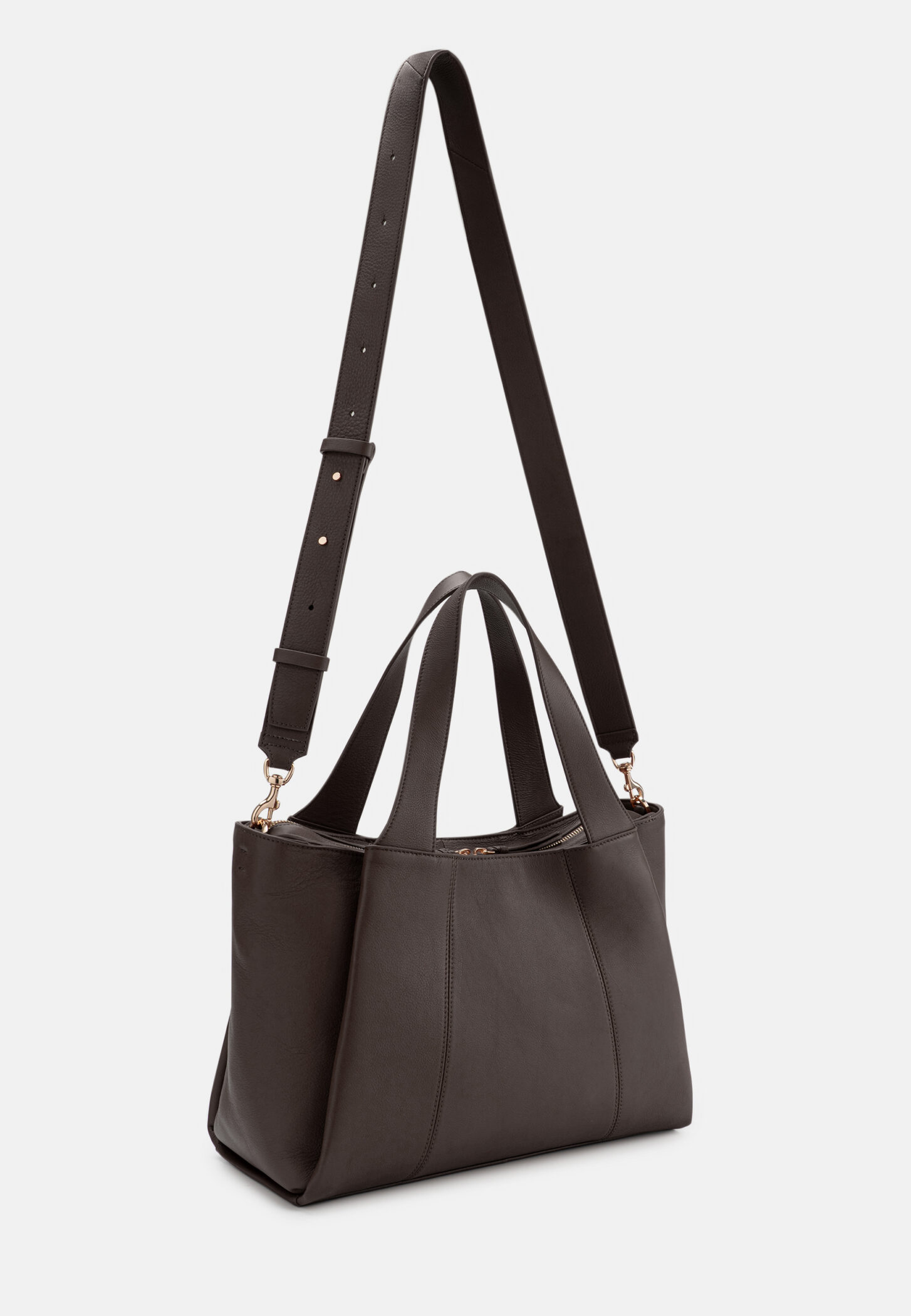 Die langen, schlanken Henkel sind stabil gearbeitet und ermöglichen ein komfortables Tragen über der Schulter. Sie gehen fließend in den Taschenkörper über und sorgen für eine ruhige, hochwertige Optik. Ergänzt wird das Design durch einen abnehmbaren, verstellbaren Schulterriemen, der vielseitige Trageoptionen bietet – von klassisch bis entspannt crossbody.