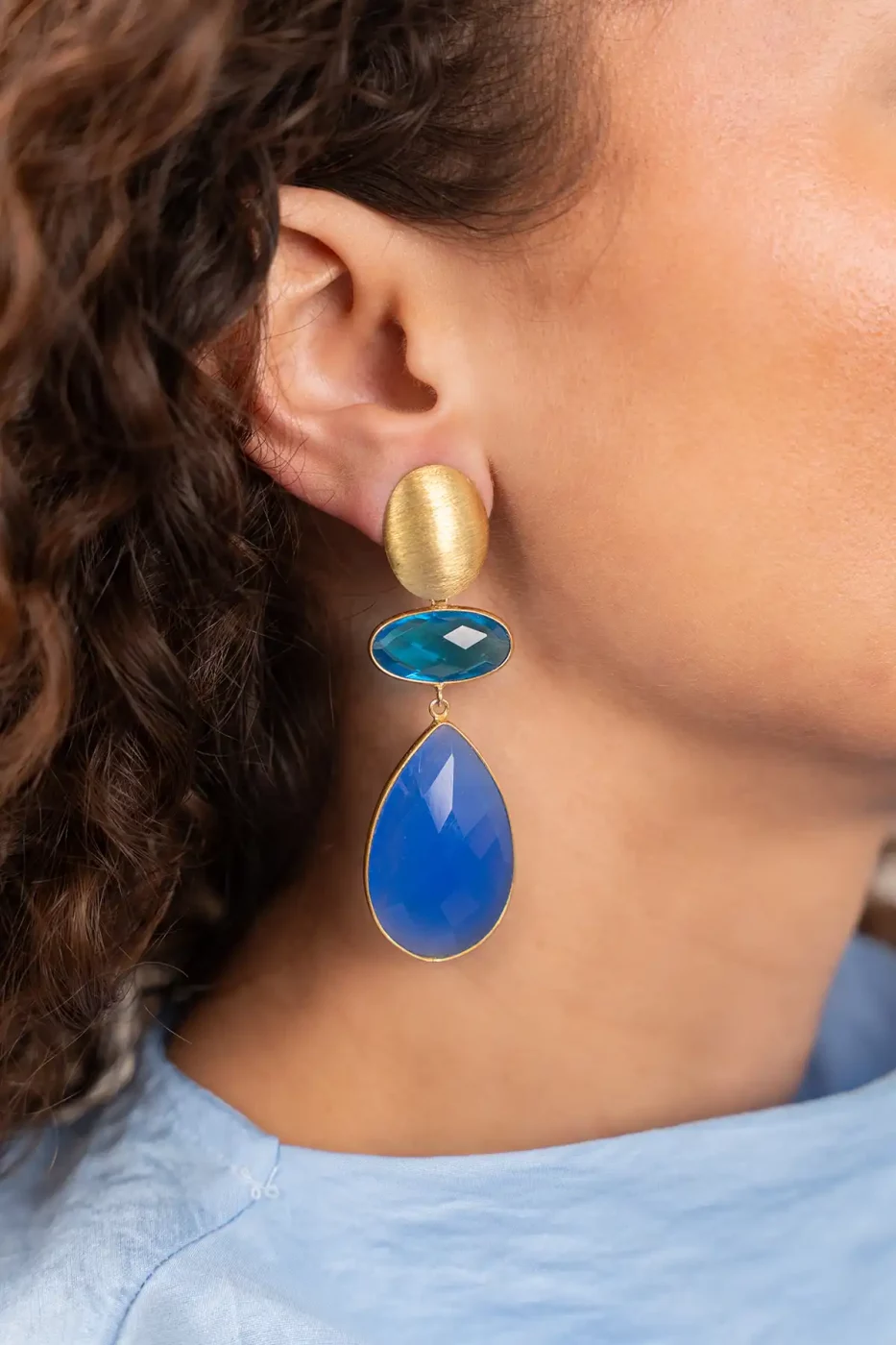 Lott Gioielli Ohrringe „Runa Double Framed Shapes Element Blue“. Dezent, funkelnd und absolut zeitgemäß: das „Runa Double Framed Shapes Element” in Blau. Hergestellt aus Quarzsteinen mit einem hellen, natürlichen Schimmer. Auffällig genug, um zu glänzen, und dennoch leicht genug für den täglichen Tragekomfort. Perfekt zu kombinieren mit allem, vom Leinenoverall bis zum festlichen Sommerkleid.