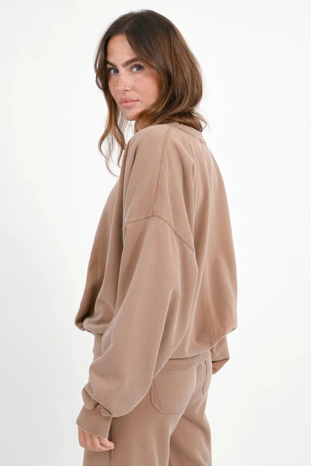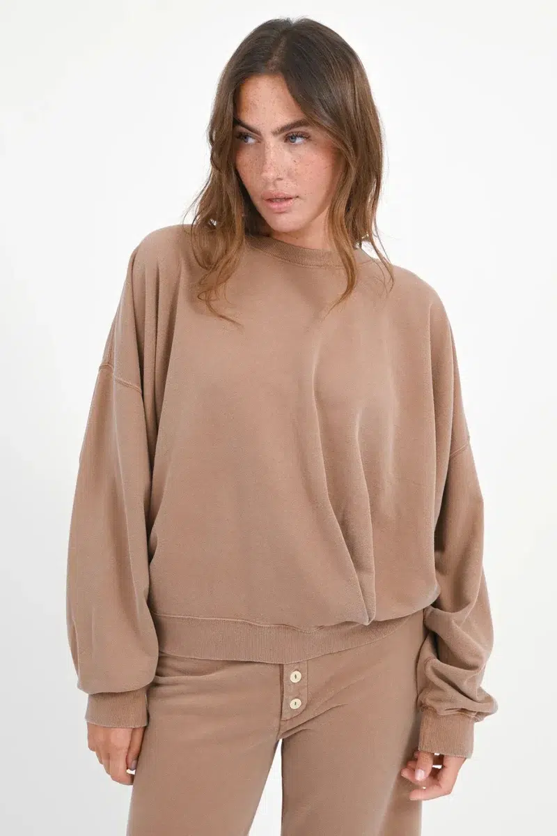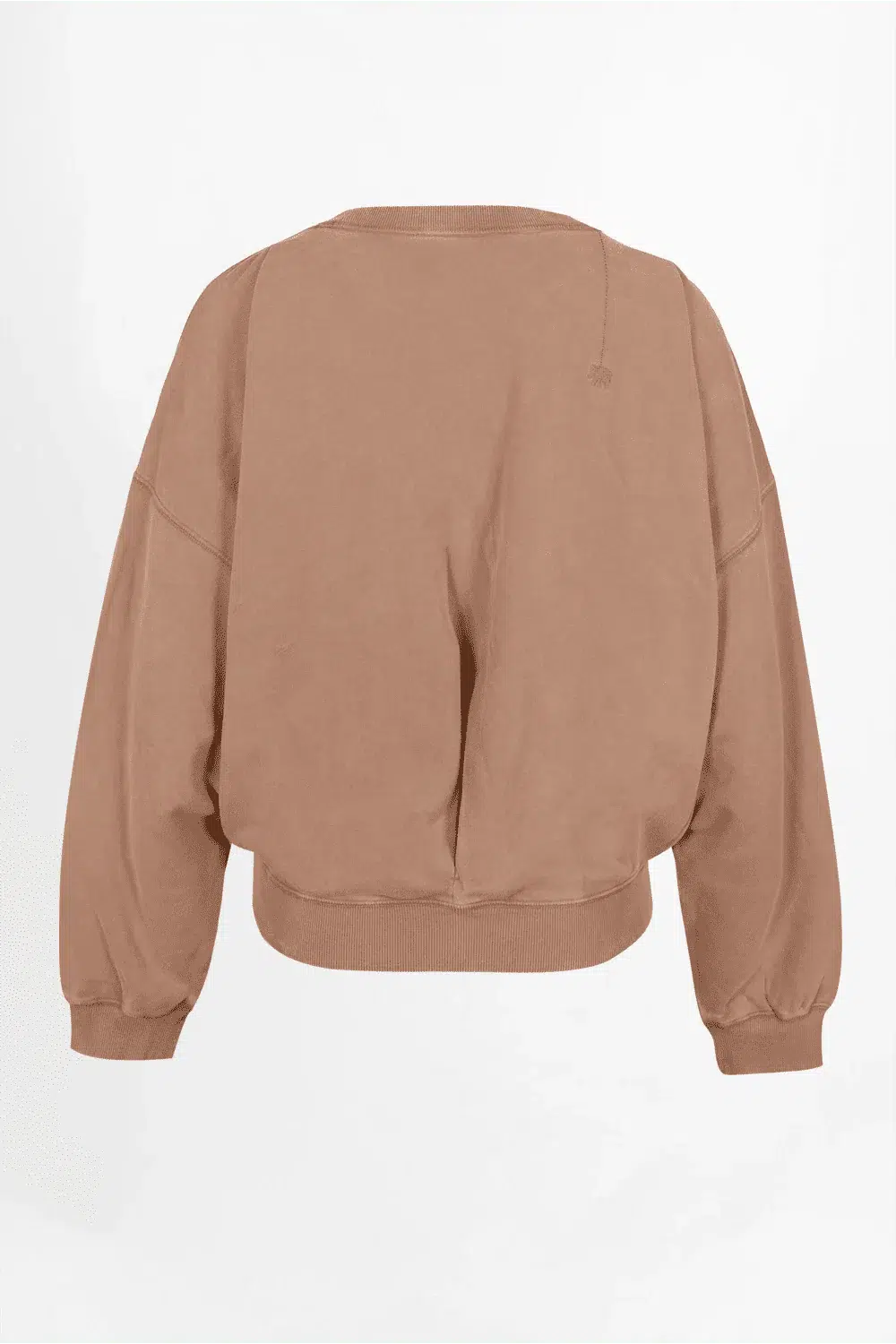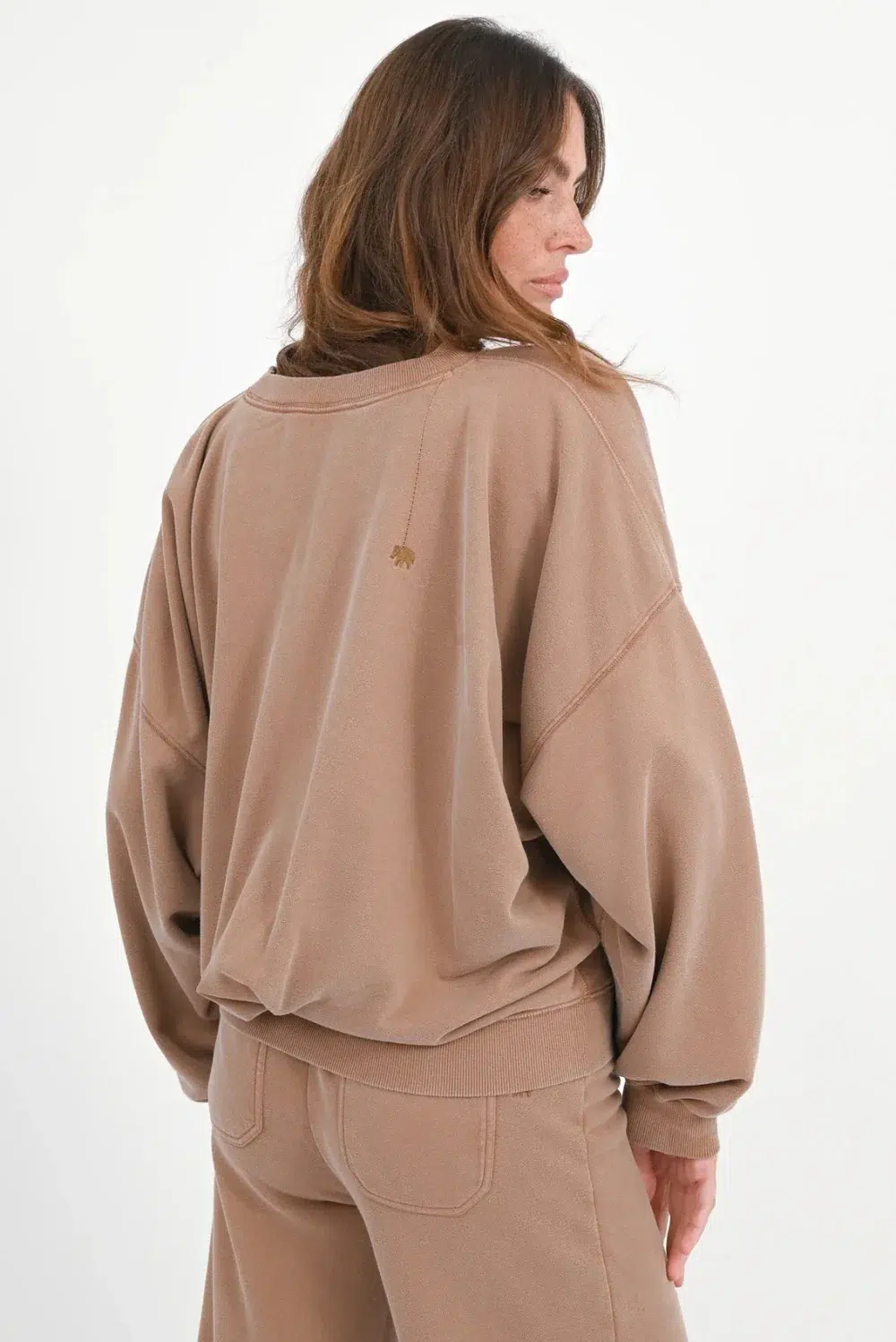 Love Joy Victory Sweatshirt „Hazelnut“. Das Sweatshirt besteht aus verwaschener Baumwolle und besticht durch Falten auf der Vorderseite. Es verfügt über einen Rundhalsausschnitt mit feinem Rippabschluss, überschnittene Schultern und weitere Ärmel, wodurch ein moderner, legerer Look entsteht. Der locker oversized Schnitt sorgt für Tragekomfort und Stil. Abschlüsse an Bündchen und Saum sind mit Rippbündchen gefertigt. Perfekt kombinierbar ist es mit der passenden Hose. Auf der rechten Rückseite befindet sich eine kleine Elefant-Stickerei.