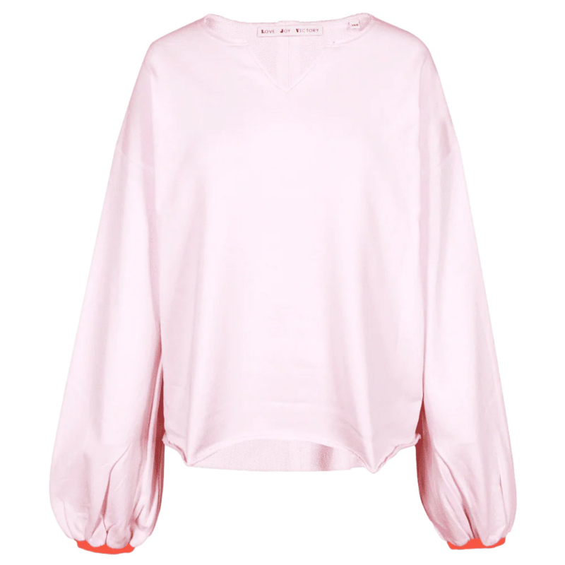 Love Joy Victory Sweatshirt „Rose Ice“. Das Oversize-Sweatshirt überzeugt mit einem schönem V-Ausschnitt und überschrittenen Schultern. Die weiten Ärmel verleihen eine lässige Silhouette. Farblich abgesetzte, elastische Bündchen setzen Akzente und sorgen für Halt. Auf der Rückseite findet sich eine bunte Ziernaht sowie offene Nähte am Saum. Eine kleine, bunte Elefant-Stickerei schmückt die rechte Rückseite.