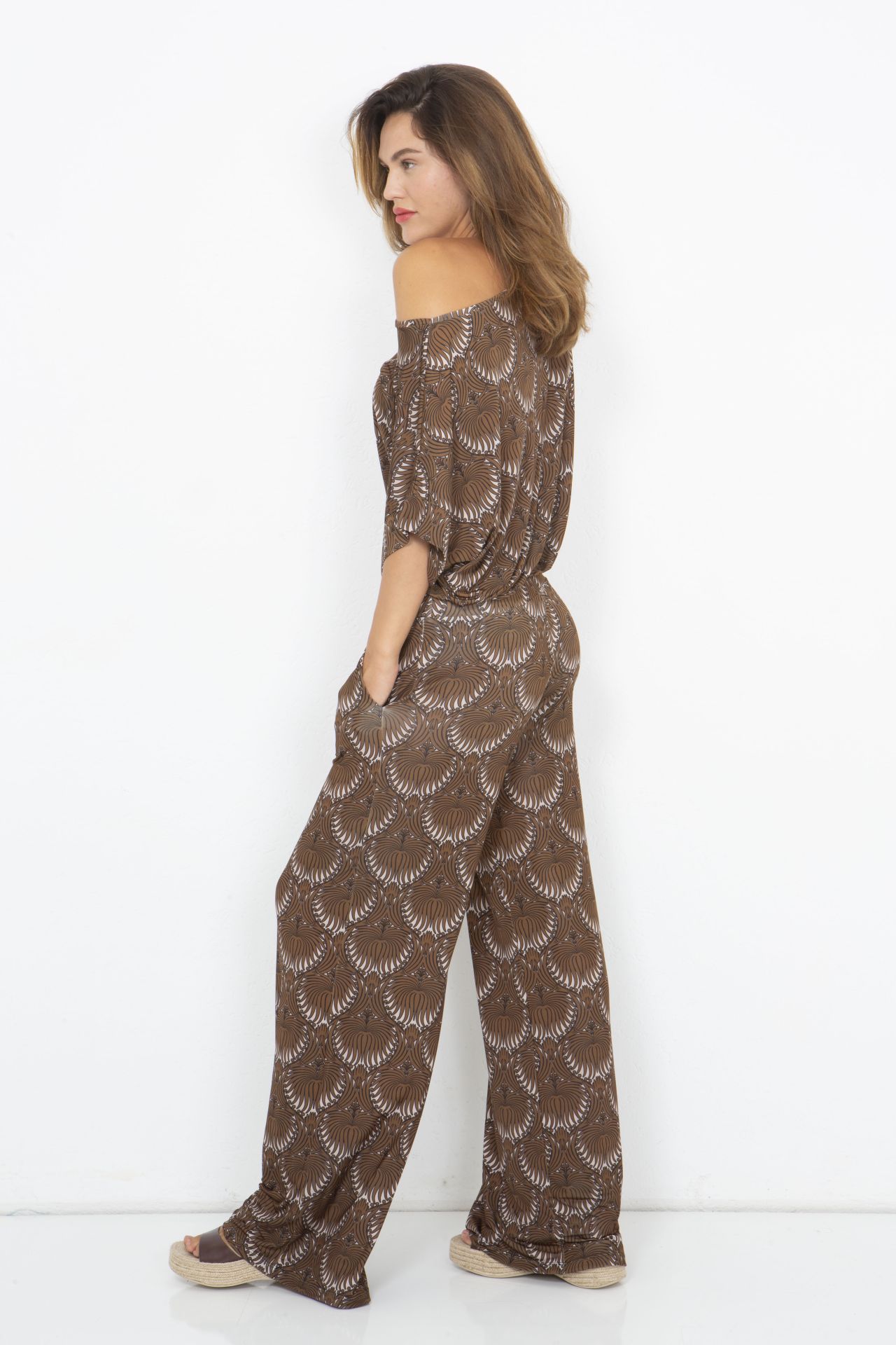 Marivie Hose „Run!“ Ethno Choco. Du willst ein Outfit, das stark aussieht und sich trotzdem leicht anfühlt? Dann ist diese Hose hier Deine neue Lieblingshose. Das kraftvolle Ethno-Muster in sattem Schokobraun trifft auf einen lockeren, fließenden Schnitt – perfekt für Tage, an denen Du einfach Du selbst sein willst. Die weite Form schenkt Dir volle Bewegungsfreiheit, während der elastische Bund für ein entspanntes Tragegefühl sorgt – den ganzen Tag lang. Ob im Alltag, auf Reisen oder beim Stadtbummel: Diese Hose macht mit, was Du vorhast. Kombinier sie mit einem schlichten Top oder spiel mit Farben. Stylisch, bequem und voller Charakter – diese Hose sagt: Run!