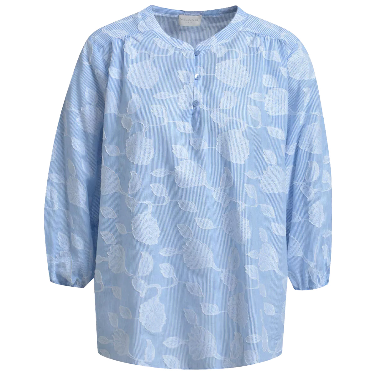 Milano Italy Bluse „Applikationen Lightblue“. Diese Bluse von Milano Italy vereint verspielte Details mit zeitloser Eleganz. Das zarte, hellblaue Baumwollgewebe wird durch feine florale Applikationen und dezente Streifen stilvoll ergänzt – ein Look, der sofort an Sommer, Leichtigkeit und moderne Feminität erinnert. Der lockere Schnitt sorgt für ein angenehmes Tragegefühl, während die 3/4-Ärmel und elastischen Bündchen eine entspannte, aber dennoch gepflegte Silhouette schaffen. Die kurze Knopfleiste und der Rundhalsausschnitt unterstreichen den cleanen, vielseitigen Charakter der Bluse. Ob lässig zur Jeans, feminin zum Rock oder etwas schicker mit Stoffhose kombiniert – dieses Modell passt sich mühelos deinem Stil an und wird schnell zum Lieblingspiece für warme Tage.