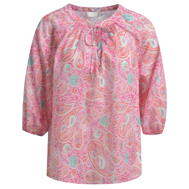 Milano Italy Bluse „Orchid Print Pink“. Diese Bluse von Milano Italy bringt frische Farben und feminine Details in Einklang. Das lebendige Paisleymuster in strahlendem Rosa, kombiniert mit zarten Farbnuancen, verleiht dem Look eine besondere Leichtigkeit und sommerliche Ausstrahlung. Der lockere Schnitt und das leichte Baumwollgewebe sorgen für ein angenehmes Tragegefühl – ideal für warme Tage. Der Rundhalsausschnitt mit V-Cut und optionaler Schleife setzt einen verspielten Akzent und lässt sich je nach Styling individuell variieren. Die 3/4-Ärmel mit elastischen Bündchen runden das Design entspannt und komfortabel ab. Ob casual zur Denim oder etwas eleganter kombiniert – diese Bluse ist ein vielseitiger Begleiter für feminine Sommerlooks.