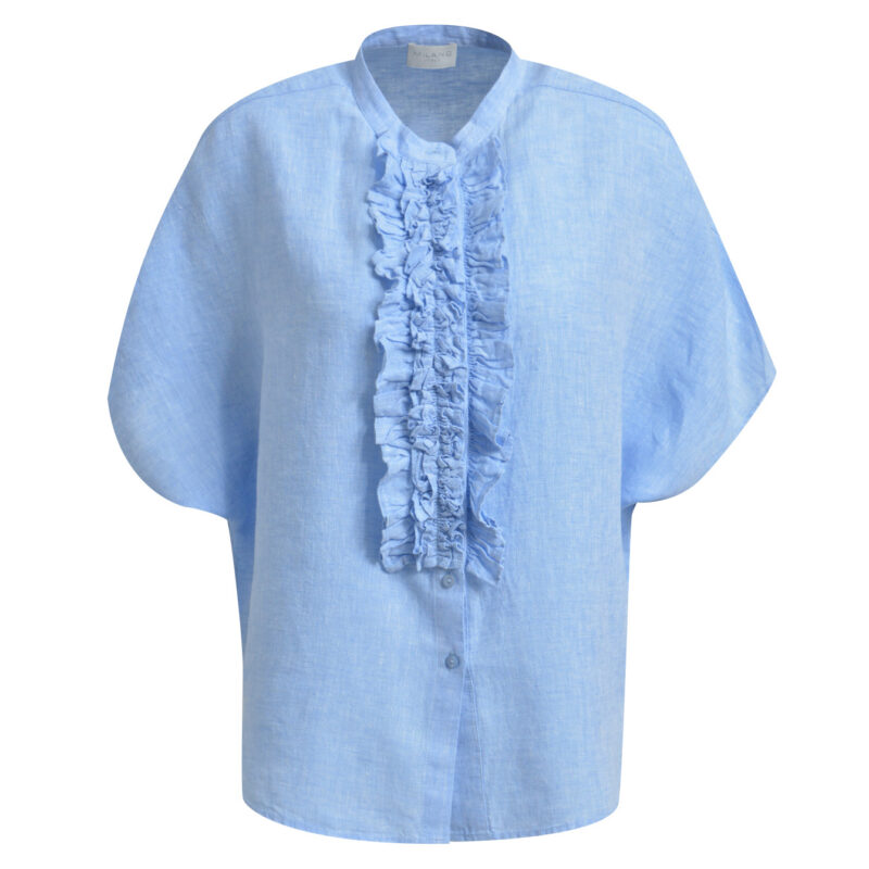 Milano Italy Bluse „Rüschen lightblue“. Die Milano Italy Bluse „Rüschen lightblue“ vereint feminine Details mit einem modernen, entspannten Look und wird damit zum perfekten Highlight für stilvolle Sommer-Outfits. Gefertigt aus leichtem Leinen überzeugt sie durch ihre luftige Qualität und sorgt auch an warmen Tagen für ein angenehm frisches Tragegefühl.