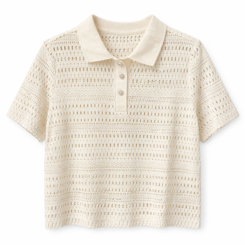 Milano Italy Polo „Gehäkelt“. Dieses Polo von Milano Italy besticht durch seine feine, gehäkelte Optik und sorgt damit für einen besonders luftigen, sommerlichen Look. Der klassische Polokragen und die dezente Knopfleiste verleihen dem Modell eine elegante Note, während die leichte Transparenz dem Shirt eine moderne, feminine Ausstrahlung gibt. Perfekt für warme Tage und vielseitig kombinierbar.