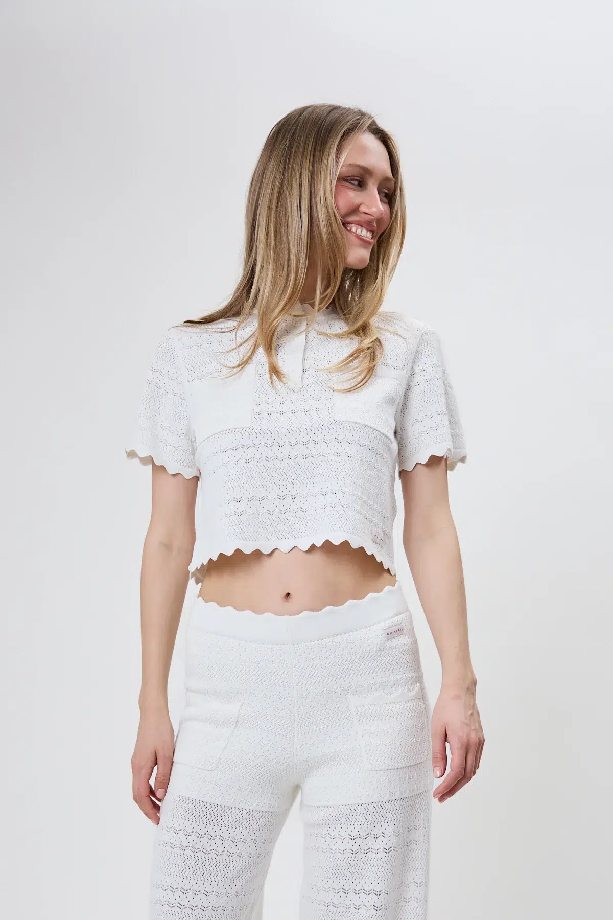Oh April T-Shirt „Serin Off White“. Das „Serin“ T-Shirt von OH APRIL überzeugt mit seiner feinen Strickoptik und einer femininen, körpernahen Passform. Die zarte Struktur verleiht dem Design eine besondere Leichtigkeit, während die kleinen Details wie die Brusttaschen und die dekorativen Abschlüsse dem Shirt einen verspielten Charakter geben. Das dezente OH APRIL Label setzt einen hochwertigen Akzent und rundet den Look stilvoll ab. Ob solo getragen oder als Teil eines Sets – dieses Piece ist ein vielseitiger Begleiter für moderne, entspannte Styles.