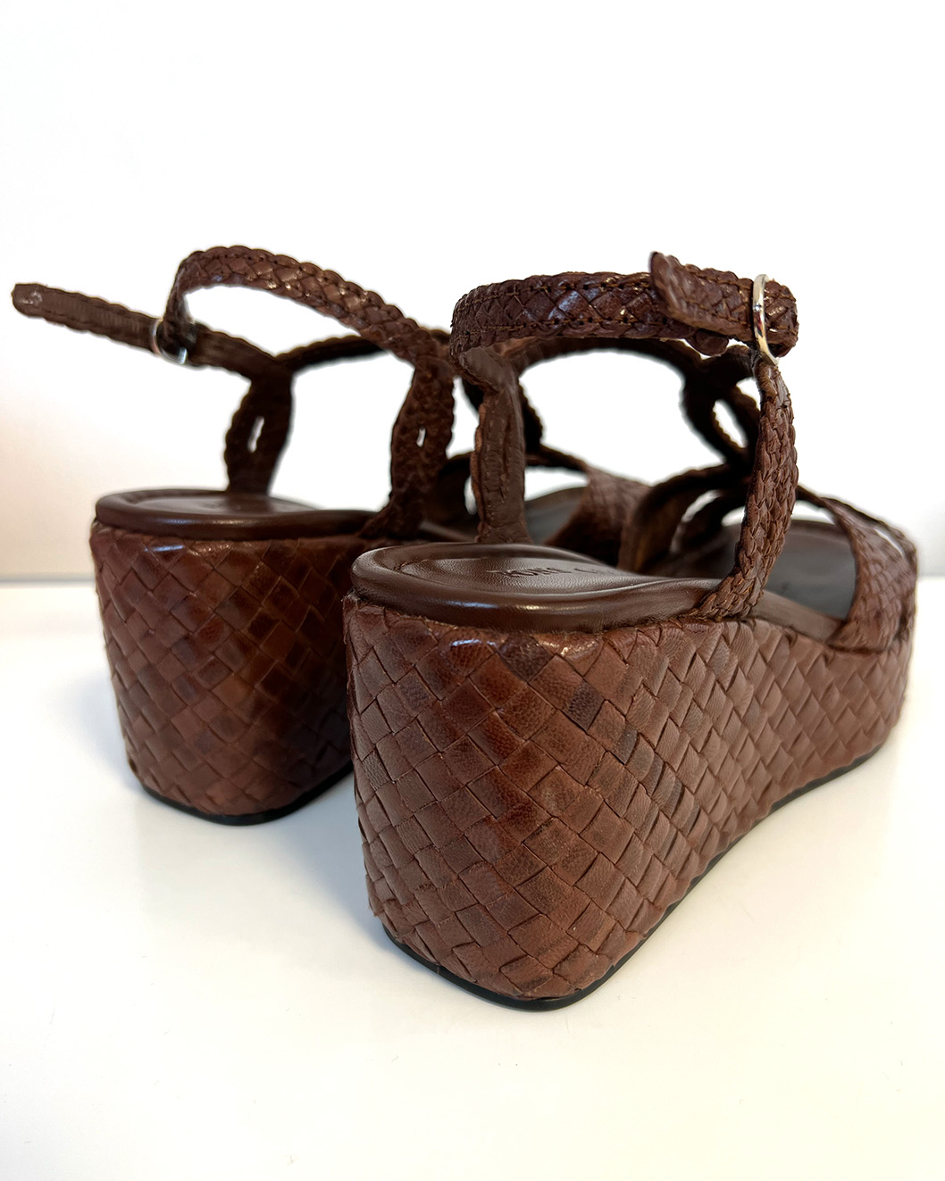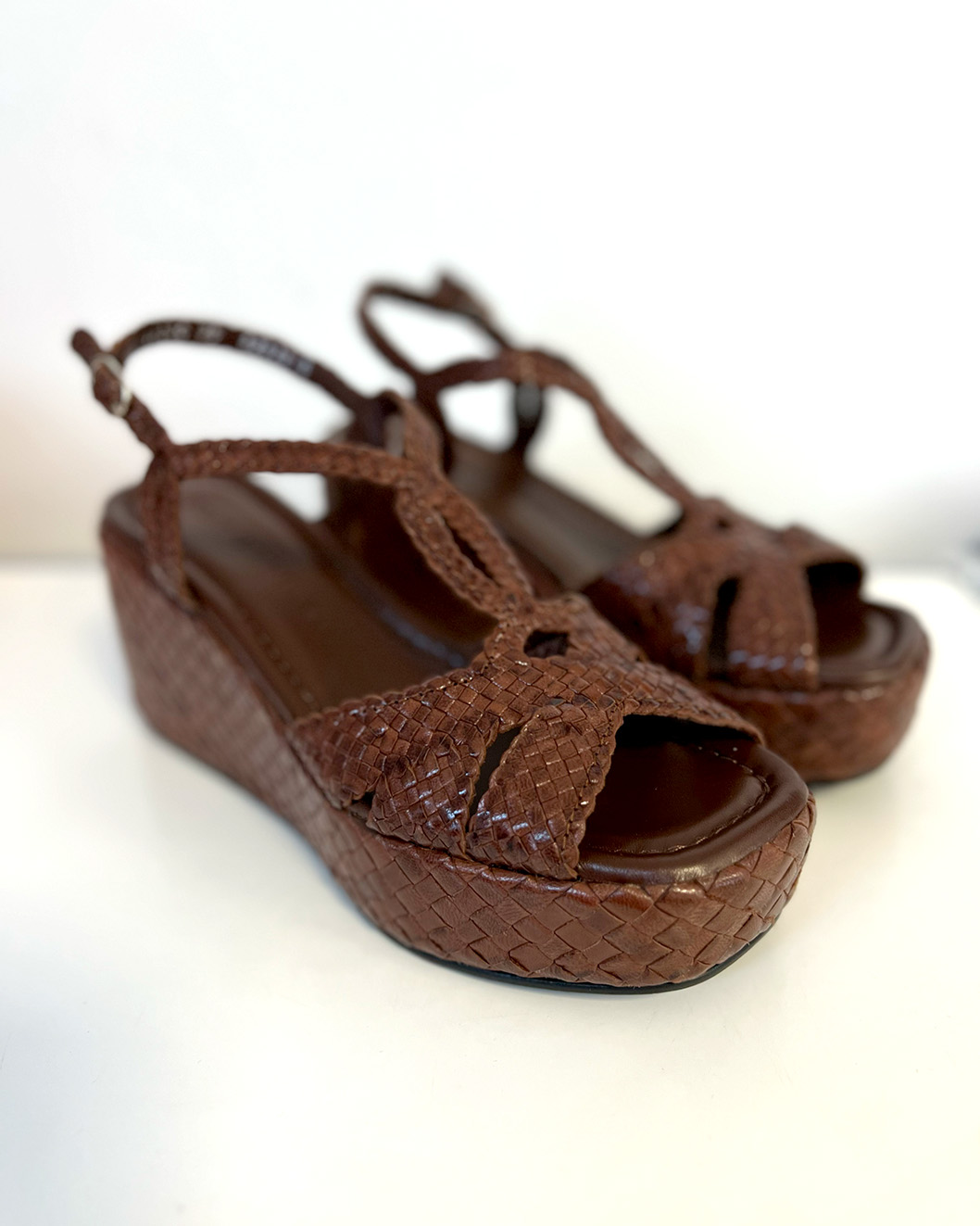 Pons Quintana Sandale „Plateau“ Caoba. Plateausandale aus handgeflochtenem Leder. Diese wunderschöne Sandale aus Leder, offenbart die Kunst des Flechtens auf seinen vier Seiten. Eine Pons-Sandale ist eine hochwertige, handgefertigte Sandale aus Spanien. Sie zeichnet sich durch ihr traditionelles Design und ihre strapazierfähige Konstruktion aus. Die Sandale besteht aus hochwertigem Leder und verfügt über eine bequeme, gepolsterte Innensohle. Das charakteristische Merkmal der Pons-Sandale ist die handgenähte Sohle, die für zusätzlichen Komfort und Halt sorgt.