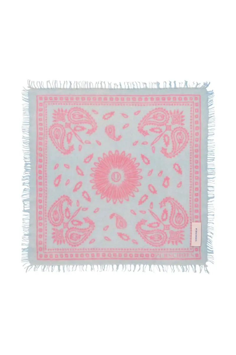 PUR SCHOEN BANDANA Paisley Big „Bloom Bleu-Flamingo“. Ein Quadrattuch im Bandana-Print mit ikonischem Paisley-Motiv – grafisch, ruhig und modern interpretiert. Gefertigt aus Jersey Cashmere, elastisch gestrickt und dadurch besonders anschmiegsam, dabei kuschelig weich und angenehm wärmend. Mit 60 × 60 cm lässt es sich vielseitig tragen: locker geknotet am Hals, präzise gefaltet zum Blazer, als Bandana im Haar oder als elegantes Detail an der Tasche. Ein kleines Statement, das Looks sofort veredelt – mühelos und selbstverständlich.