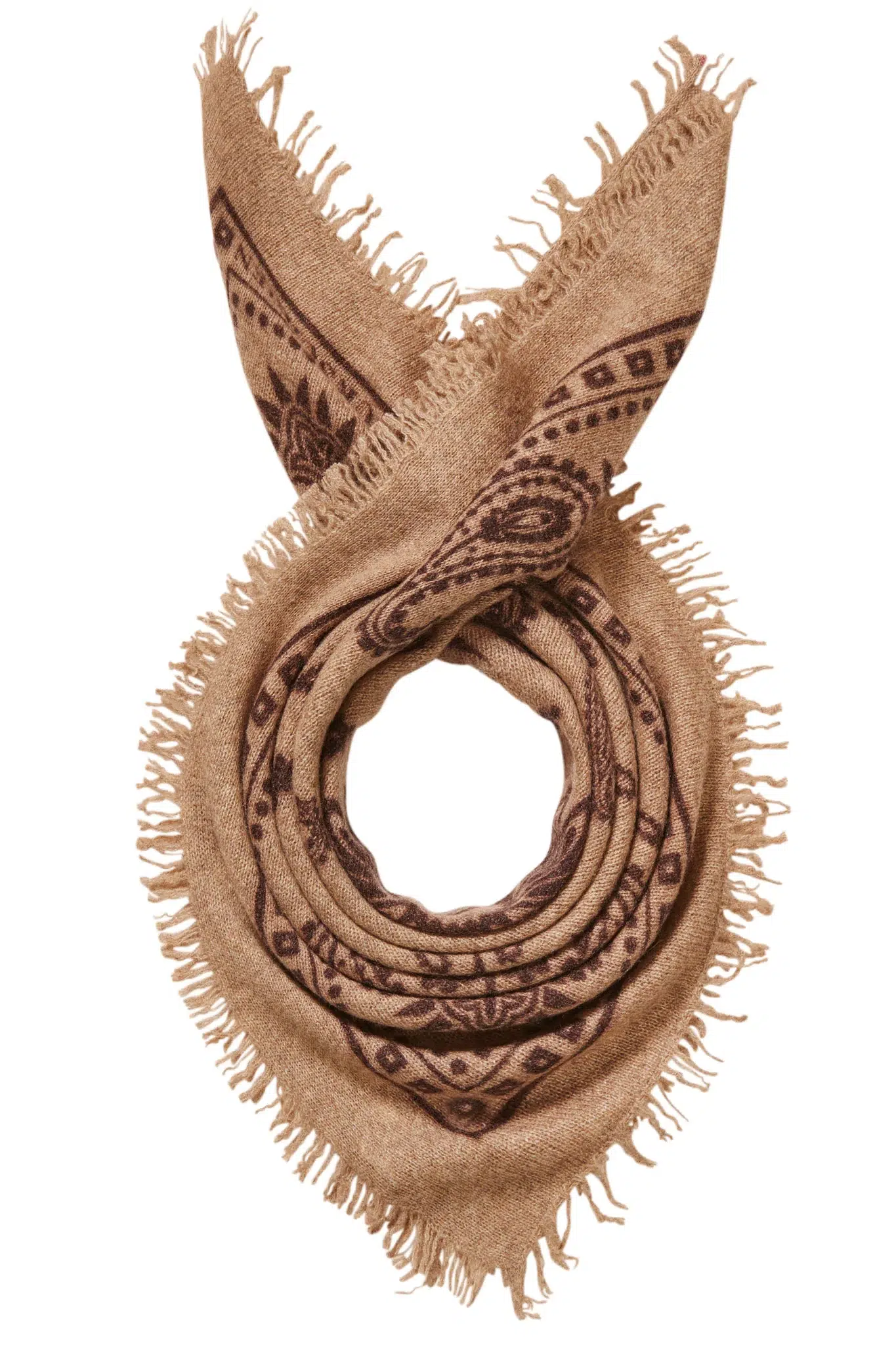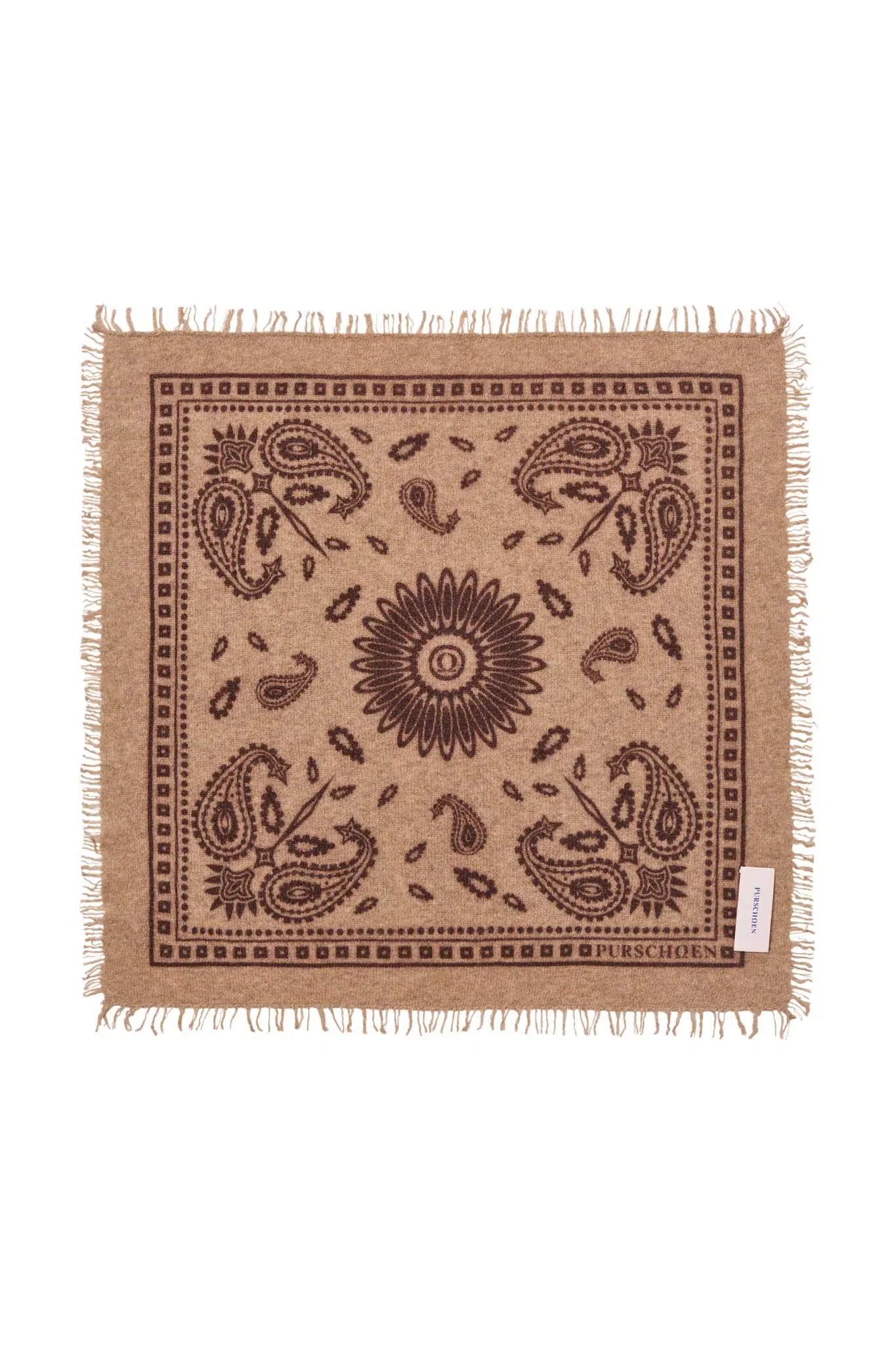 PUR SCHOEN BANDANA Paisley „Bloom Big“ Taupe-Chocolate. Ein Quadrattuch im Bandana-Print mit ikonischem Paisley-Motiv – grafisch, ruhig und modern interpretiert. Gefertigt aus Jersey Cashmere, elastisch gestrickt und dadurch besonders anschmiegsam, dabei kuschelig weich und angenehm wärmend. Mit 92 × 92 cm lässt es sich vielseitig tragen: locker geknotet am Hals, präzise gefaltet zum Blazer, als Bandana im Haar oder als elegantes Detail an der Tasche. Ein kleines Statement, das Looks sofort veredelt – mühelos und selbstverständlich.