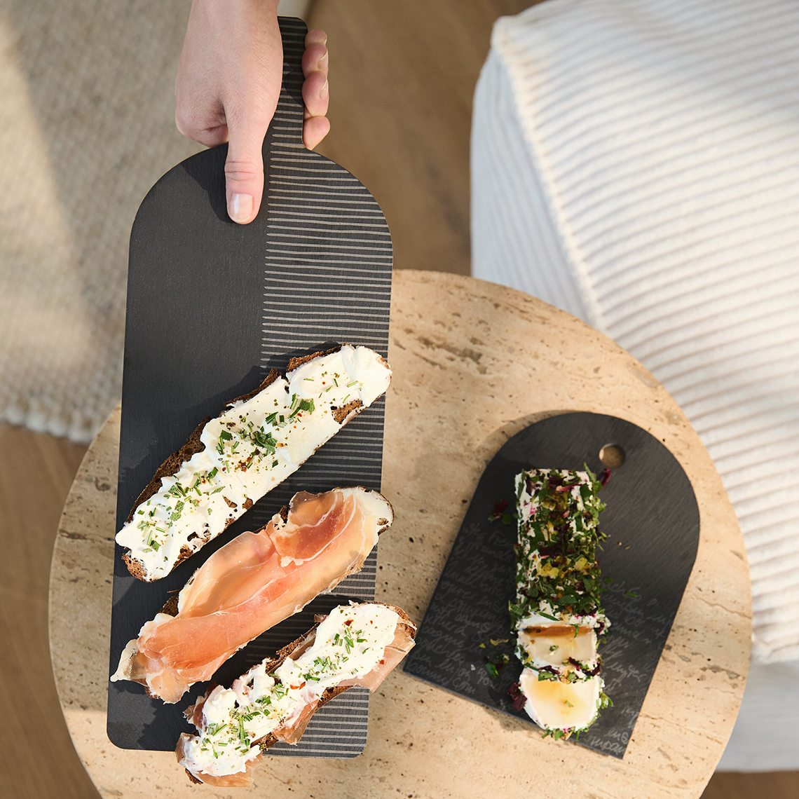 Räder Schieferplatte „Häppchenweise“ 2er-Set. Mit den Schieferplatten „Häppchenweise“ von Räder servierst Du kleine Köstlichkeiten mit Stil und Liebe zum Detail. Ob feine Tapas, süße Leckereien oder herzhafte Häppchen – auf diesen edlen Platten kommen Deine Kreationen perfekt zur Geltung. Jede Platte ist aus natürlichem Schiefer gefertigt und trägt die charmante Gravur „Häppchenweise“, die Deinem Tisch eine besondere, humorvolle Note verleiht. Durch die leicht unregelmäßige Struktur des Materials wird jede Platte zu einem echten Unikat. Ideal für Deine nächste Feier, zum Verschenken oder um Deinen Esstisch einfach ein wenig schöner zu machen.