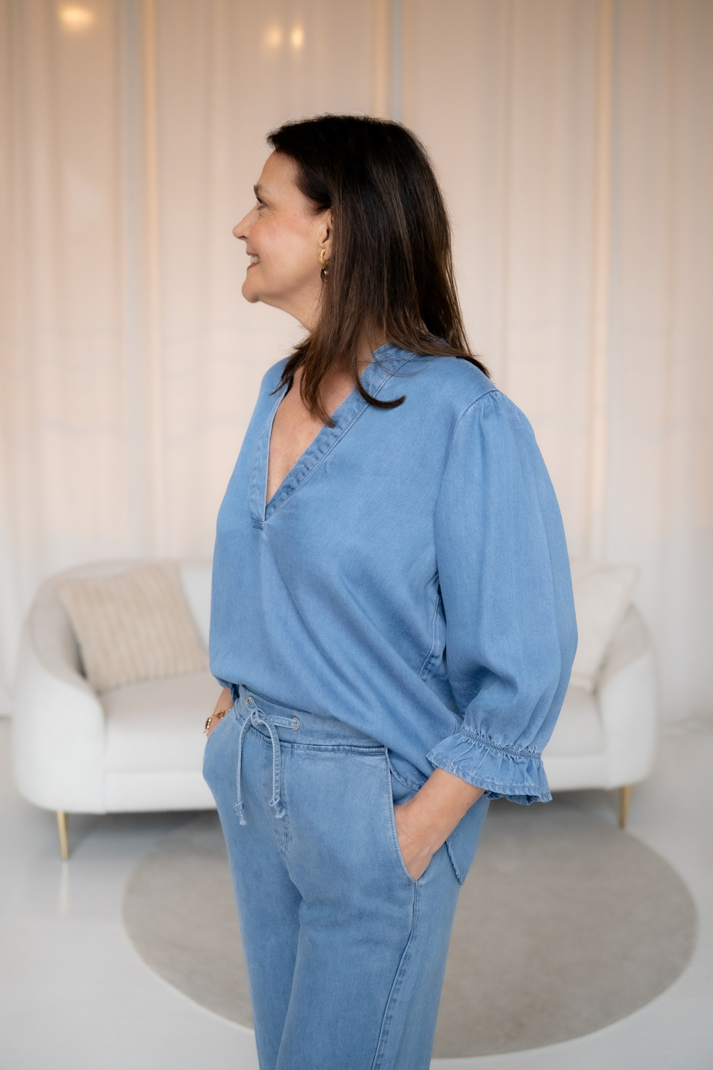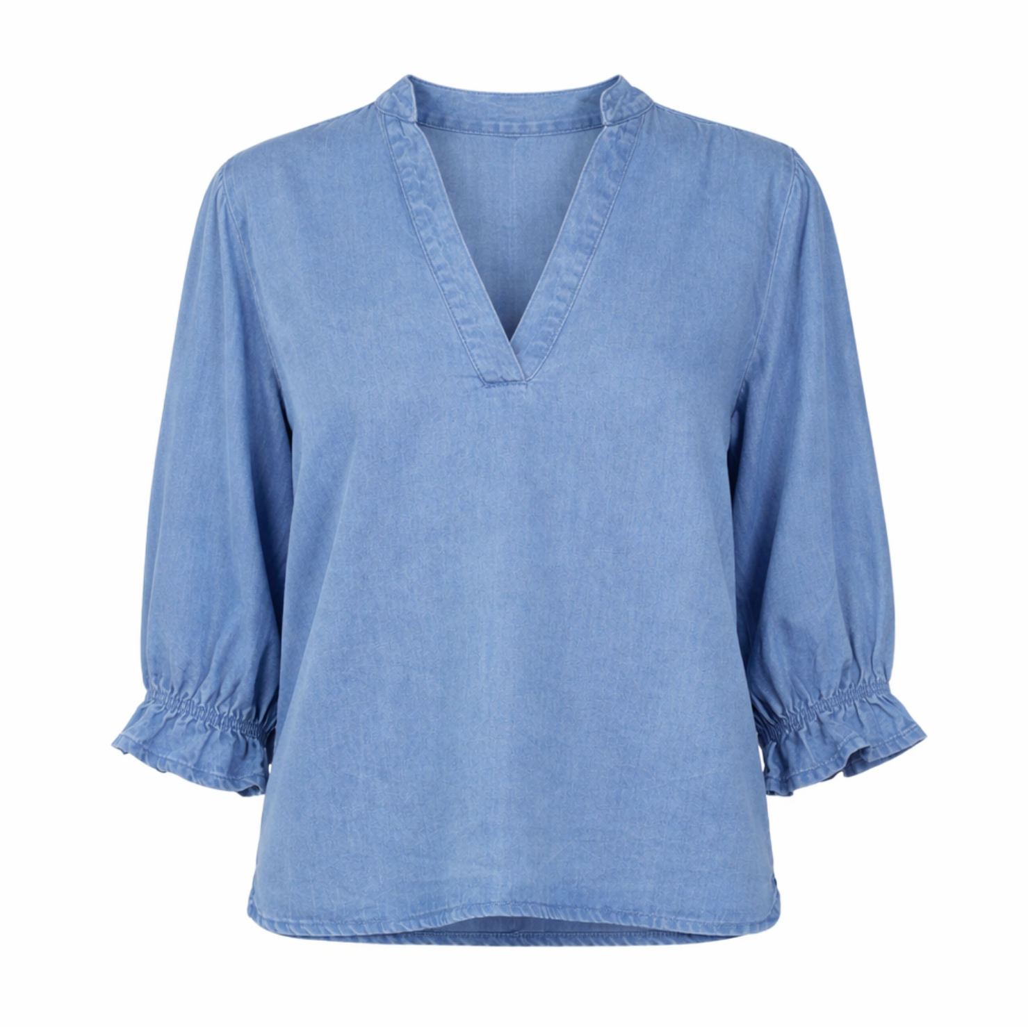 Der feminine V-Ausschnitt schmeichelt dem Dekolleté, während die 3/4-Ärmel mit elastischen Bündchen und zarter Raffung einen verspielten Akzent setzen. Der abgerundete Saum – vorne etwas kürzer geschnitten – unterstreicht die lockere Silhouette und macht die Bluse vielseitig kombinierbar, ob lässig zur Jeans oder elegant zur Stoffhose.