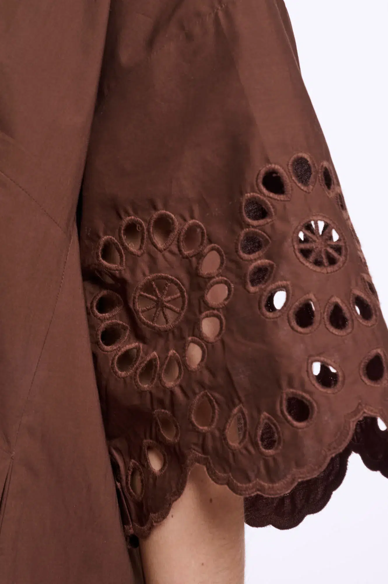 Rino & Pelle Kleid Mini „Dark Brown“. Das braune Rino & Pelle Kleid Mini präsentiert sich in einer Minilänge mit geradem Schnitt und einem femininen V-Ausschnitt, der durch einen Hemdblusenkragen ergänzt wird. Die kurzen Ärmel zeigen ein dezentes Lochmuster, das dem Kleid eine verspielte Textur verleiht. Eine Kellerfalte im Rücken sorgt für zusätzliche Weite und Bewegungsfreiheit. Das Material besteht zu 100% aus Baumwolle, wodurch das Kleid angenehm kühl und atmungsaktiv trägt. Insgesamt vermittelt das Kleid eine frische, sommerliche Optik mit einer klaren, modernen Silhouette.