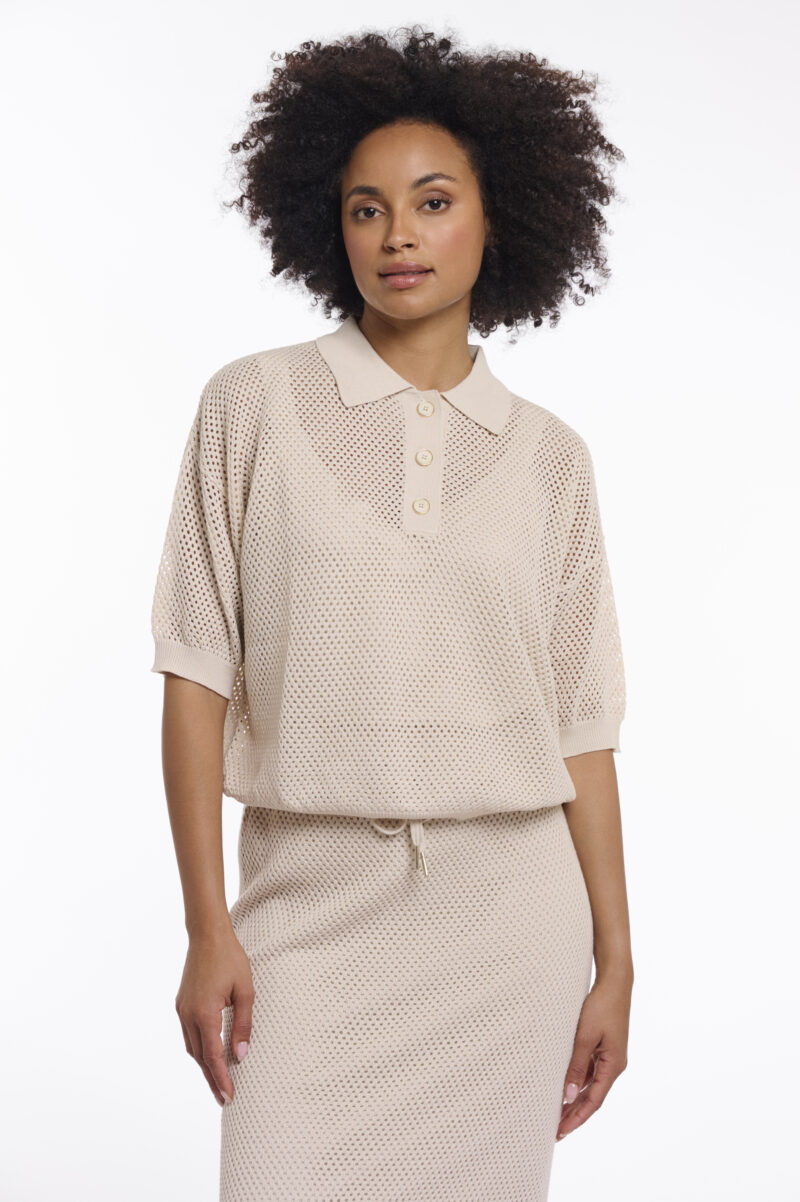 Rino & Pelle Polo-Shirt Strick „Gio Birch“. Hüllen Sie sich in mühelose Eleganz mit diesem kurzärmeligen Strickoberteil, das sich leicht und atmungsaktiv anfühlt. Das Poloshirt besticht durch das leicht transparente Lochmuster und erzeugt einen modernen, strukturierten Look.