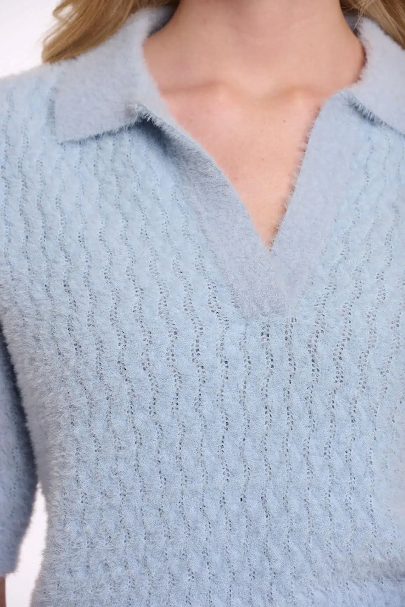 Rino & Pelle Poloshirt „Light Blue“. Entspannen Sie sich in gemütlicher Eleganz mit diesem weichen Strick-Poloshirt, das mit einem raffinierten Kragen und einem sanften V-Ausschnitt gestaltet ist. Die ellbogenlangen Ärmel verfügen über ein dezentes Puffdetail, das der lockeren Silhouette einen Hauch von moderner Weiblichkeit verleiht. Der elastische Saum sorgt für eine etwas vollere Form und bietet einen eleganten und dennoch bequemen Look.