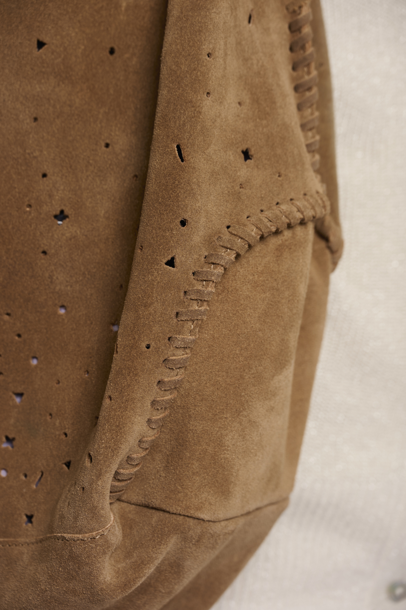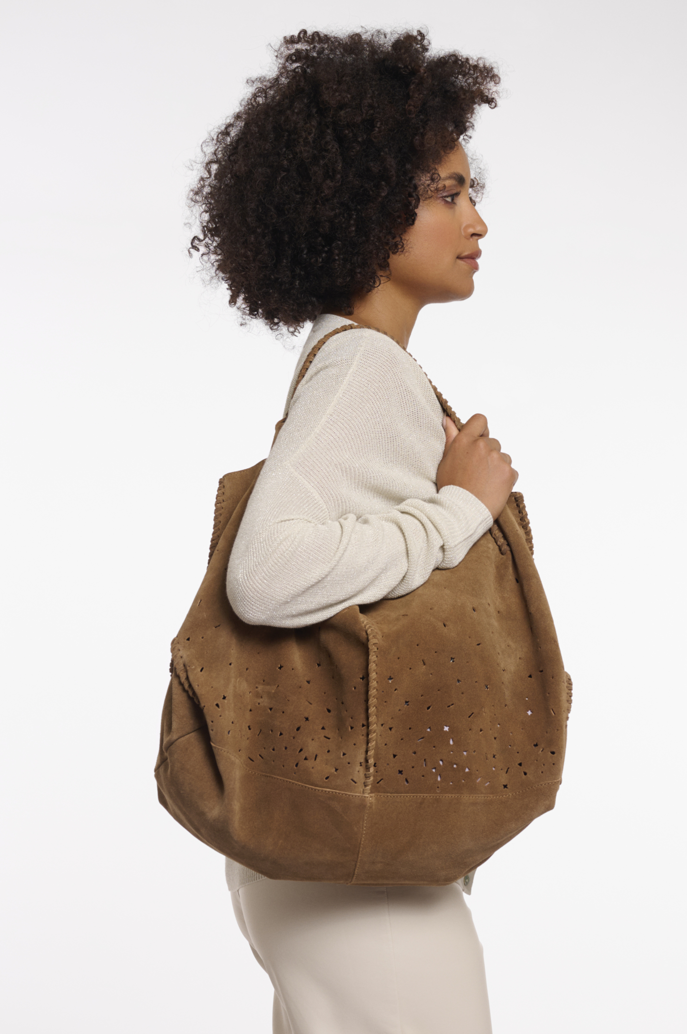 Dank ihres großzügigen Formats bietet die Tasche viel Platz für Alltagsessentials – ideal für Shopping, Büro oder entspannte City-Looks. Die weiche Haptik des Wildleders und die robusten Henkel sorgen für angenehmen Tragekomfort, während die lässige Form eine mühelos elegante Wirkung erzielt.
