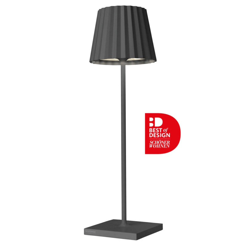 Sompex Tischlampe „Troll 2.0“ Anthrazit. Die Outdoortischleuchte mit dem unverkennbaren Plissee-Schirm. Aus Aluminium gefertigt und in diversen Farben und Mustern beschichtet, kann die TROLL 2.0 dank IP54 Klassifizierung Indoor und Outdoor eingesetzt werden. Die kräftigen Akkus bieten bis zu 24 Stunden kabelloses Licht. Über den Touch-Sensor auf der Oberseite der Leuchte kann die Leuchte stufenlos gedimmt und die zwischen zwei warmweißen Lichtfarben gewählt werden. Über die mitgelieferte Ladestation lässt sich die TROLL 2.0 im Handumdrehen wieder aufladen.