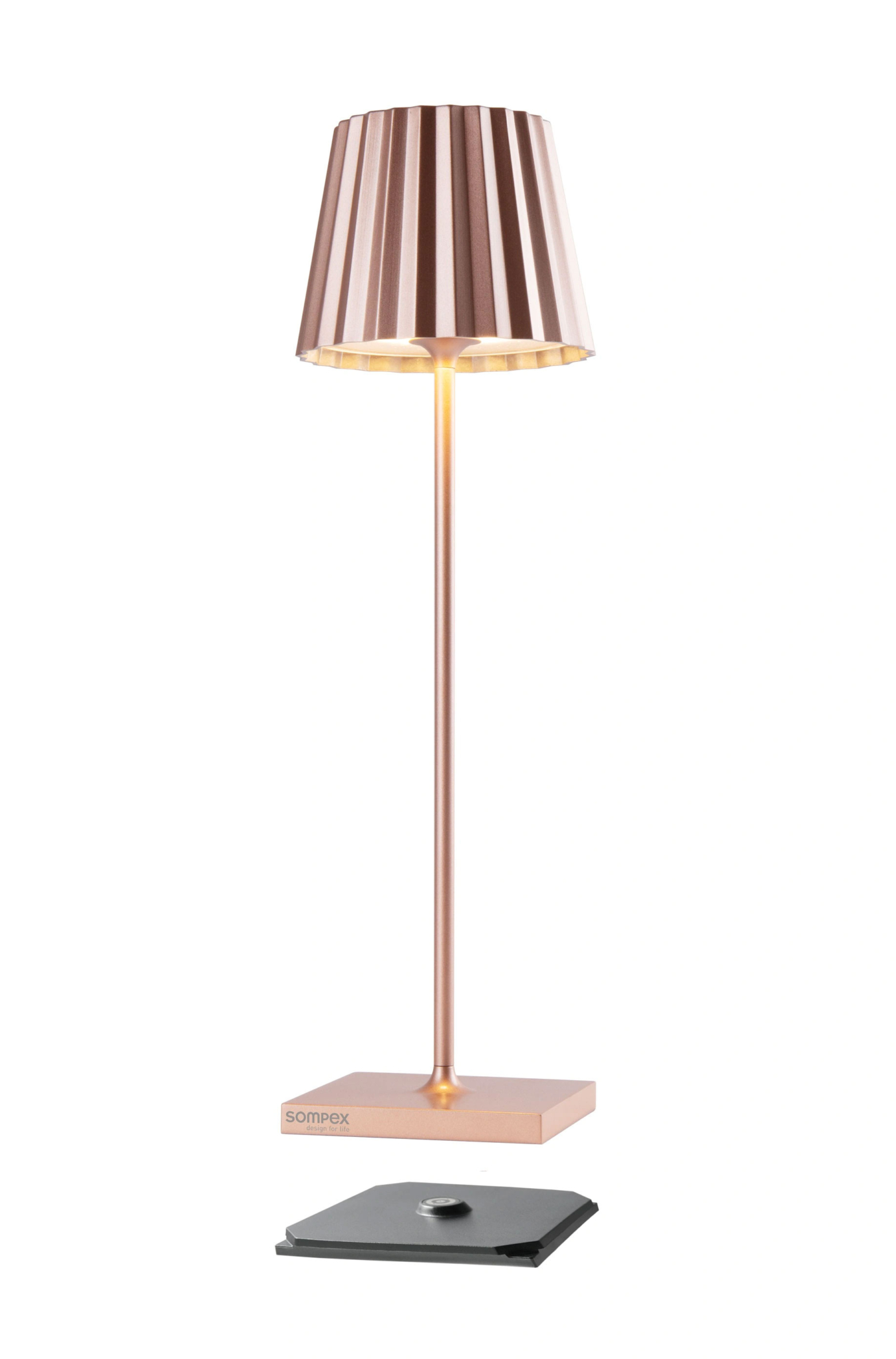 Sompex Tischlampe „Troll 2.0“ Roségold. Die Outdoortischleuchte mit dem unverkennbaren Plissee-Schirm. Aus Aluminium gefertigt und in diversen Farben und Mustern beschichtet, kann die TROLL 2.0 dank IP54 Klassifizierung Indoor und Outdoor eingesetzt werden. Die kräftigen Akkus bieten bis zu 24 Stunden kabelloses Licht. Über den Touch-Sensor auf der Oberseite der Leuchte kann die Leuchte stufenlos gedimmt und die zwischen zwei warmweißen Lichtfarben gewählt werden. Über die mitgelieferte Ladestation lässt sich die TROLL 2.0 im Handumdrehen wieder aufladen.