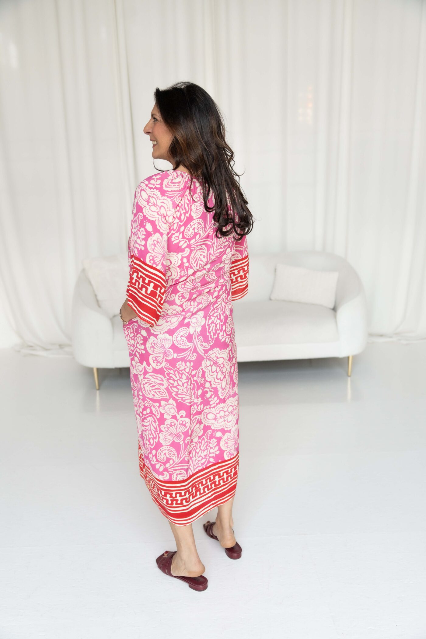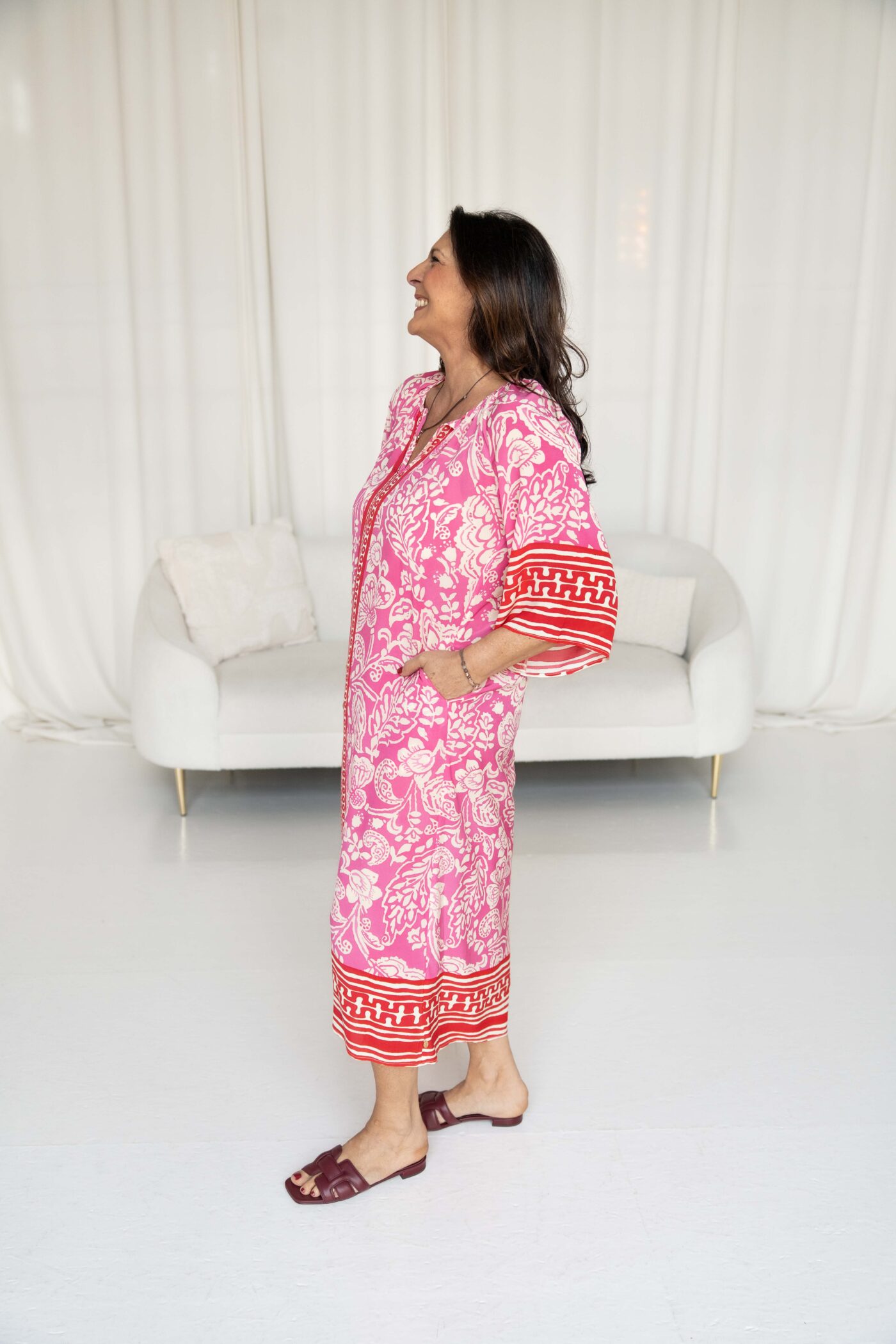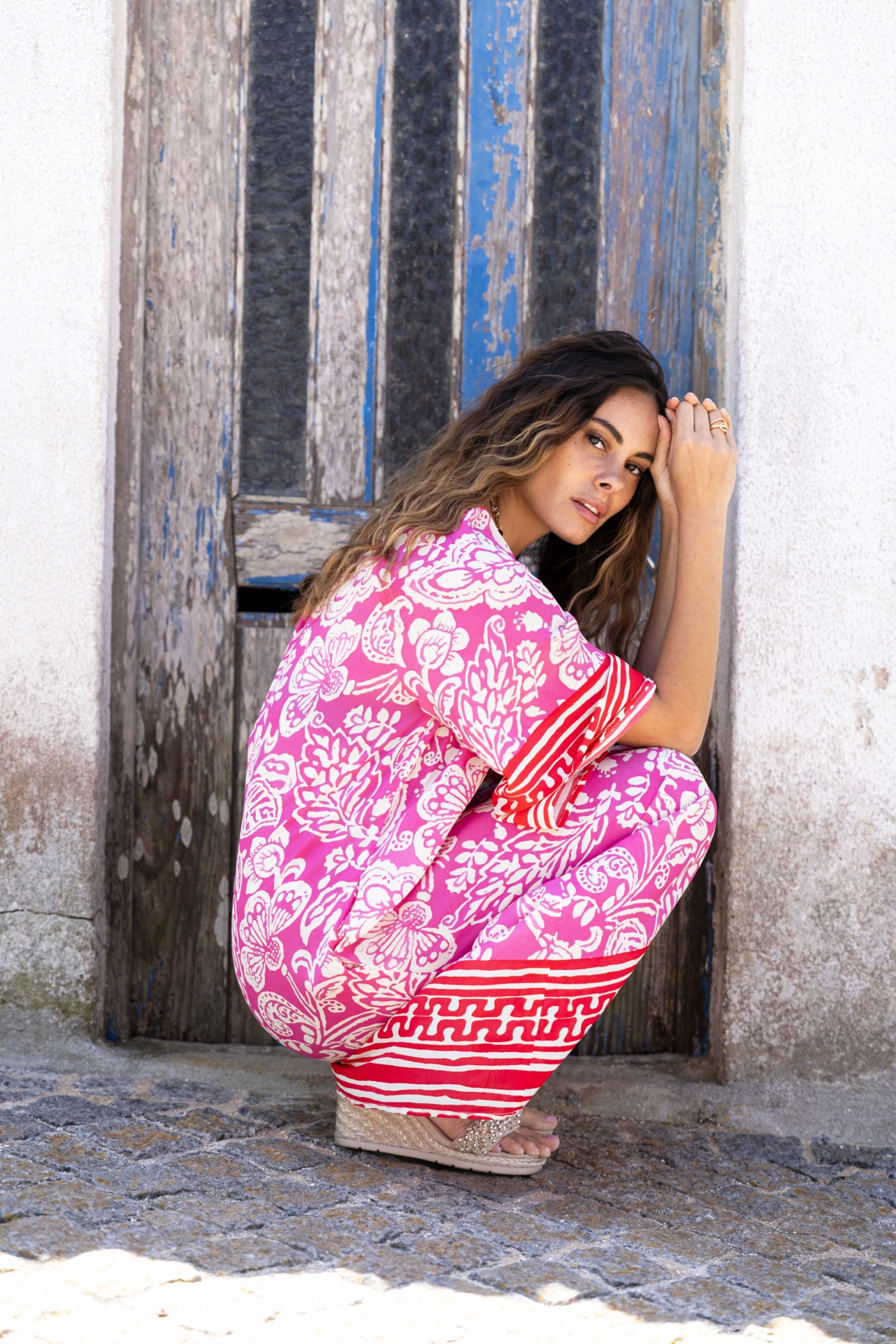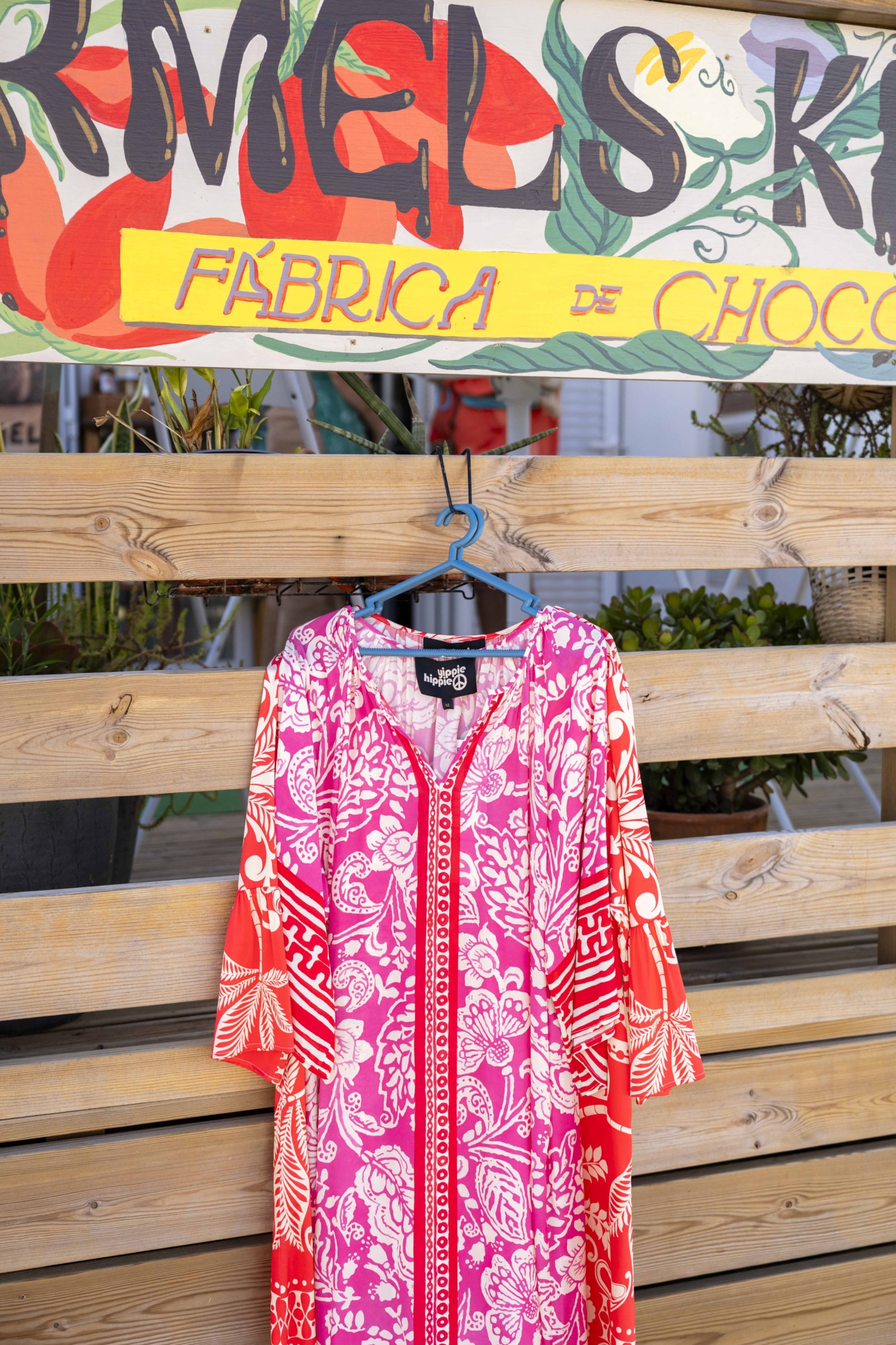 Yippie Hippie Kleid „rot pink“ *Neue Kollektion*. Ein echter Blickfang für sonnige Tage: Dieses Yippie Hippie Kleid begeistert mit seinem frischen Farbspiel aus Pink auf Weiß und einem lebendigen floralen Muster. Besonders raffiniert ist der rot-weiße Streifen, der ab dem V-Ausschnitt – inklusive Ausschnitt – bis nach unten verläuft und dem Kleid eine moderne, streckende Optik verleiht.