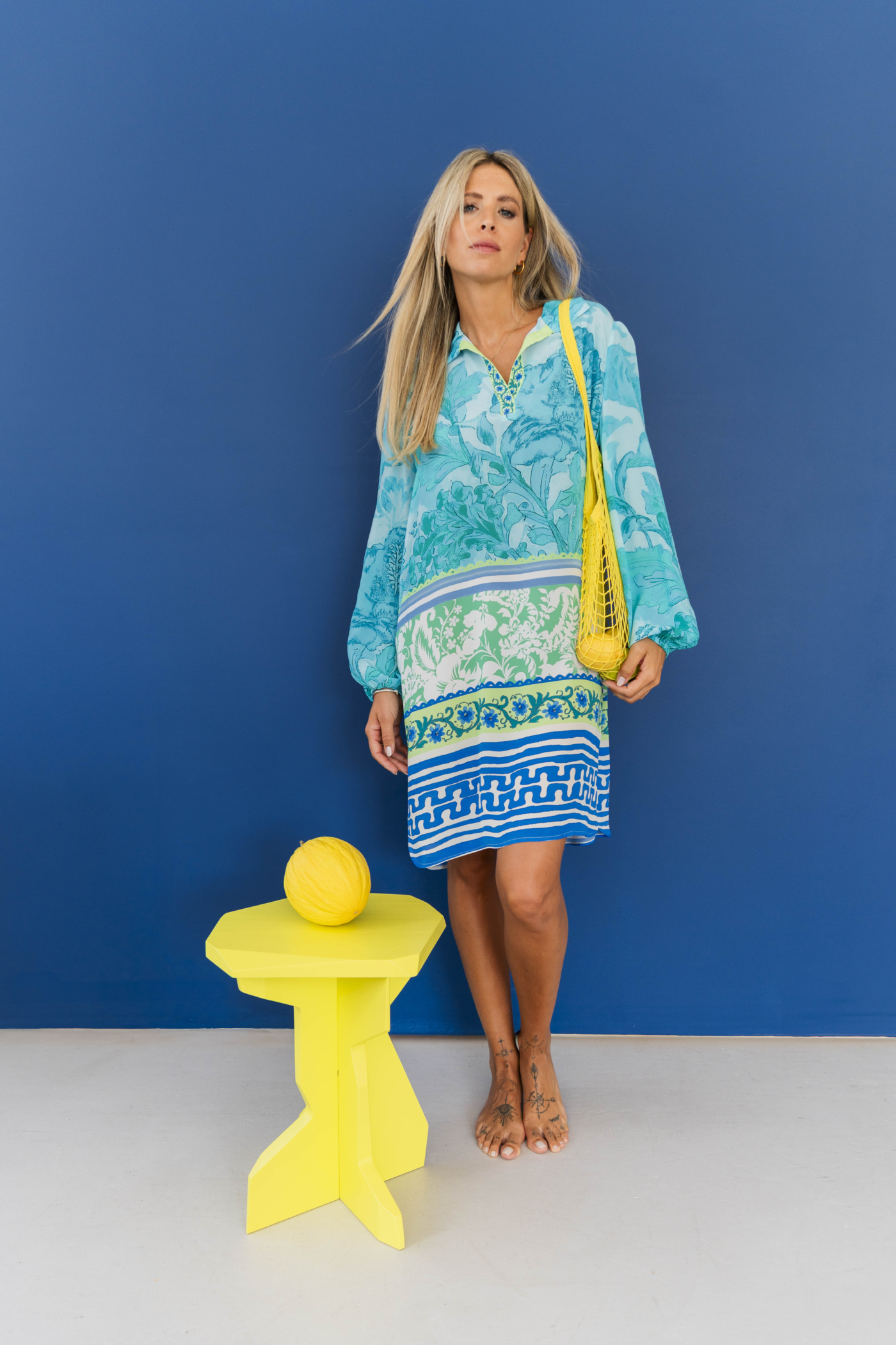 Der feminine V-Ausschnitt wird von einem kontrastierenden Kragen in einem anderen Muster eingerahmt und setzt damit einen stilvollen, farblich abgesetzten Akzent. Diese besondere Detailverliebtheit macht das Kleid zu einem echten Hingucker mit typischem Yippie-Hippie-Charakter.