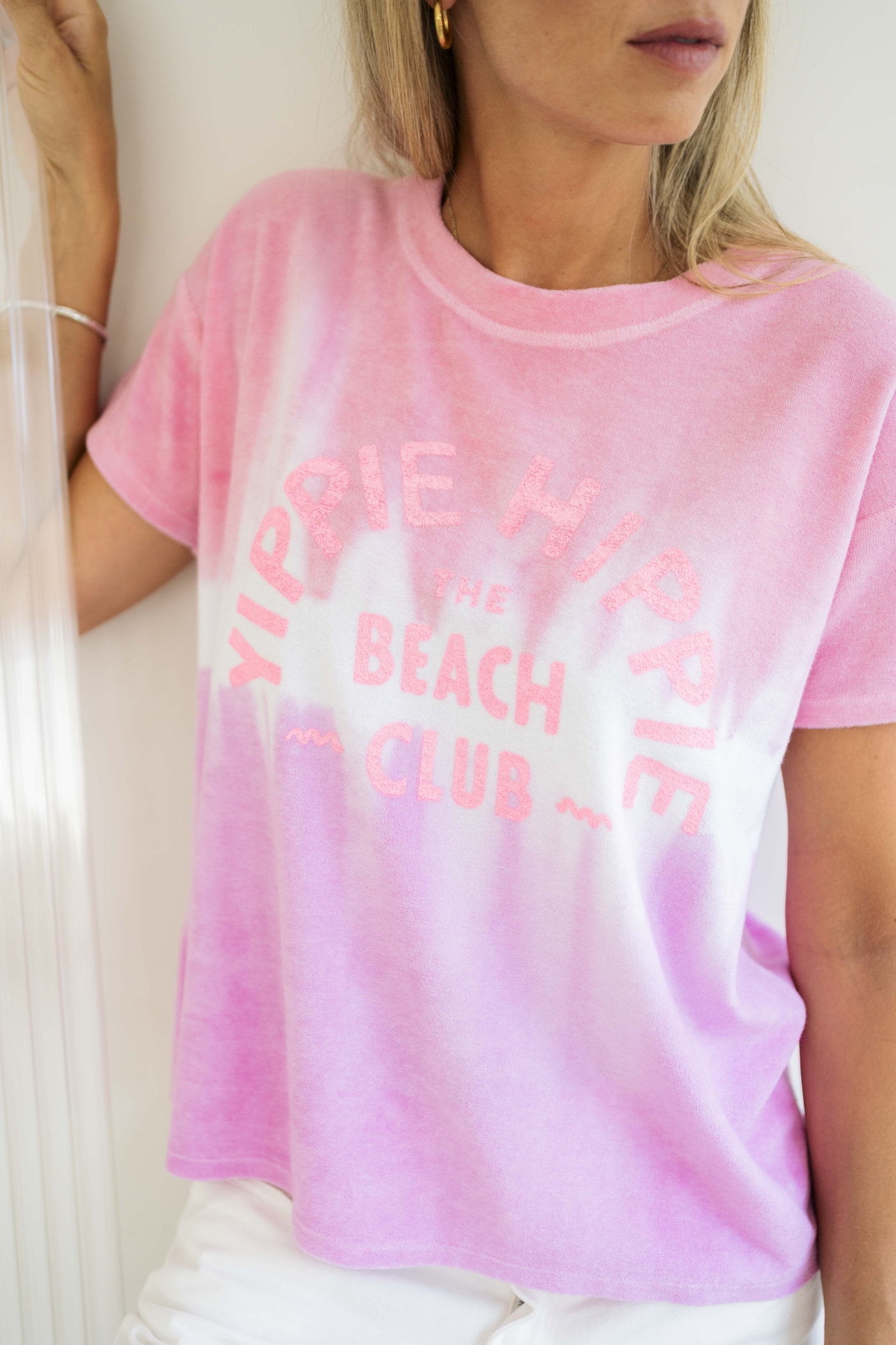Yippie Hippie Shirt „The Beach Club“ *Neue Kollektion*. Dieses handgefertigte Batik-Shirt von Yippie Hippie bringt sommerliche Leichtigkeit direkt in deinen Kleiderschrank. Die einzigartige Batik in Pink, Rosa und Weiß macht jedes Shirt zu einem Unikat und verleiht deinem Look verspielte Farbakzente. Der Schriftzug „The Beach Club“ unterstreicht den lässigen, sonnigen Charakter des Designs und sorgt für Urlaubsfeeling pur.
